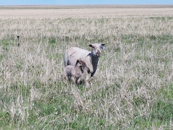 Most of the lambs have arrived. As usual it was a busy 3 weeks, with about 600 lambs arriving in that time span. It went well, the lambs are a good size and strong, the weather has been good, and the ewes are getting more self sufficient every year. The majority are out in a larger pasture so it is important that each ewe knows how many lambs she has and where they are. When the lambs are young, the stick pretty close to their mom, but as they age, they get bolder and more independent and stray further away. When I walk through the flock each morning, one of the things I am looking for is missing or hungry lambs. Usually the best indicator that a lamb has gone missing (we have had a couple coyotes hanging around grabbing the odd take-our meal) is a ewe that is looking for it. In the mid morning, after the ewes have grazed, they usually bed down with their lambs nearby for a rest.