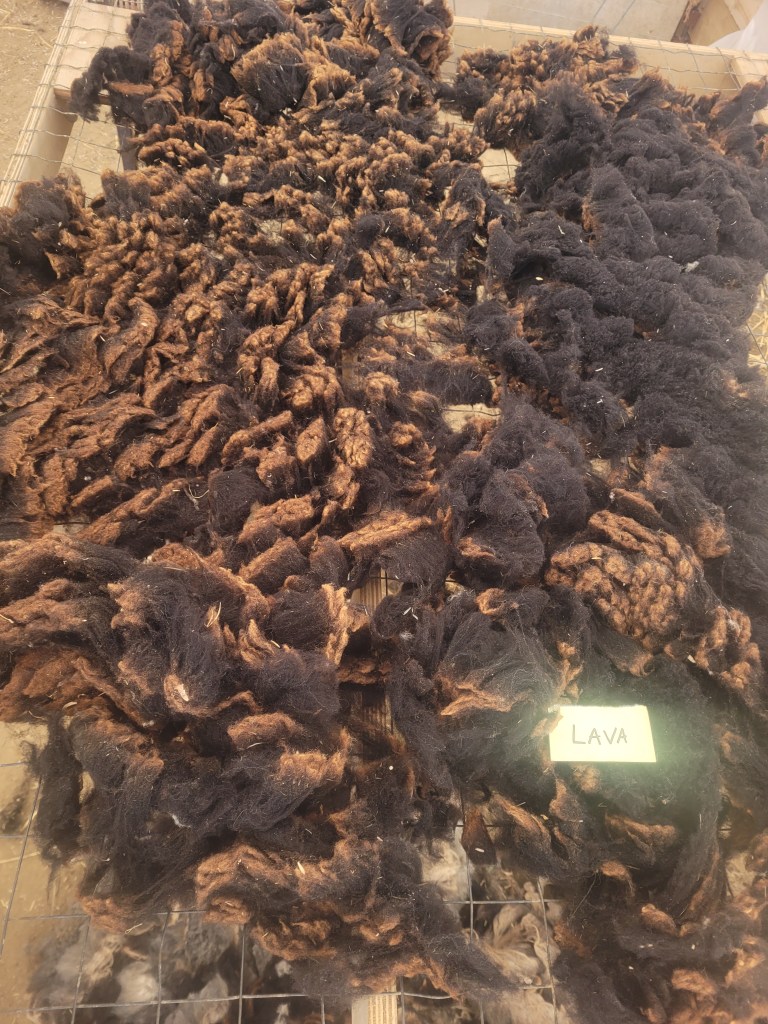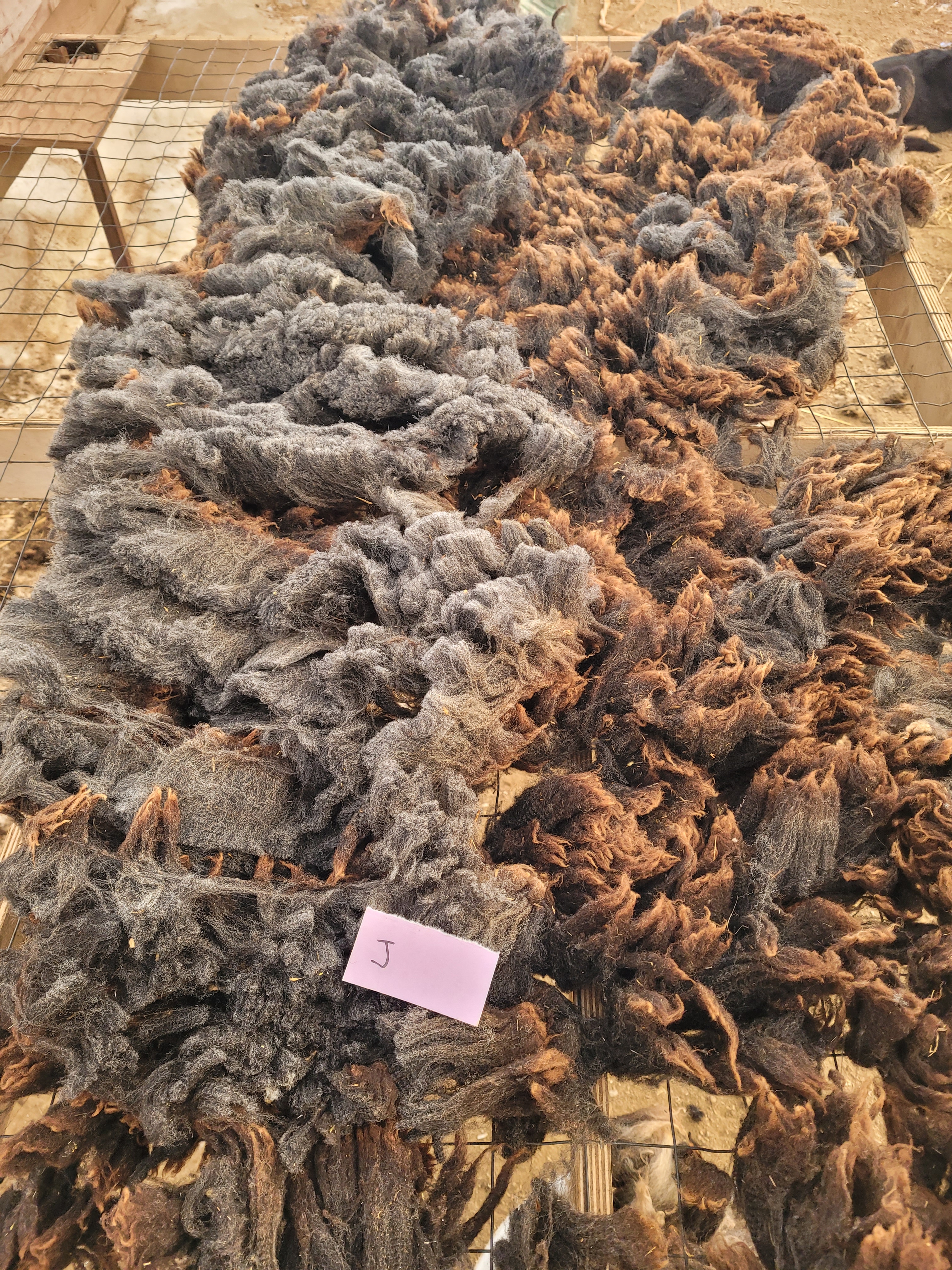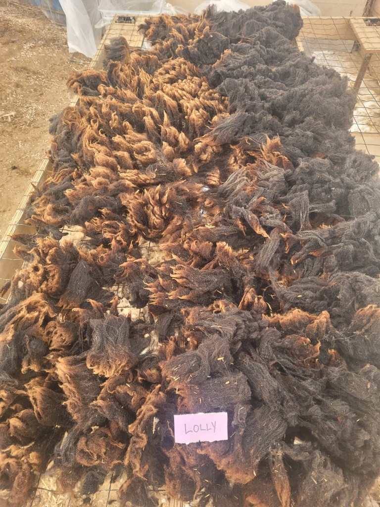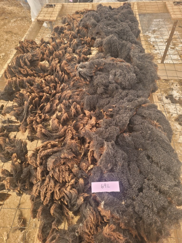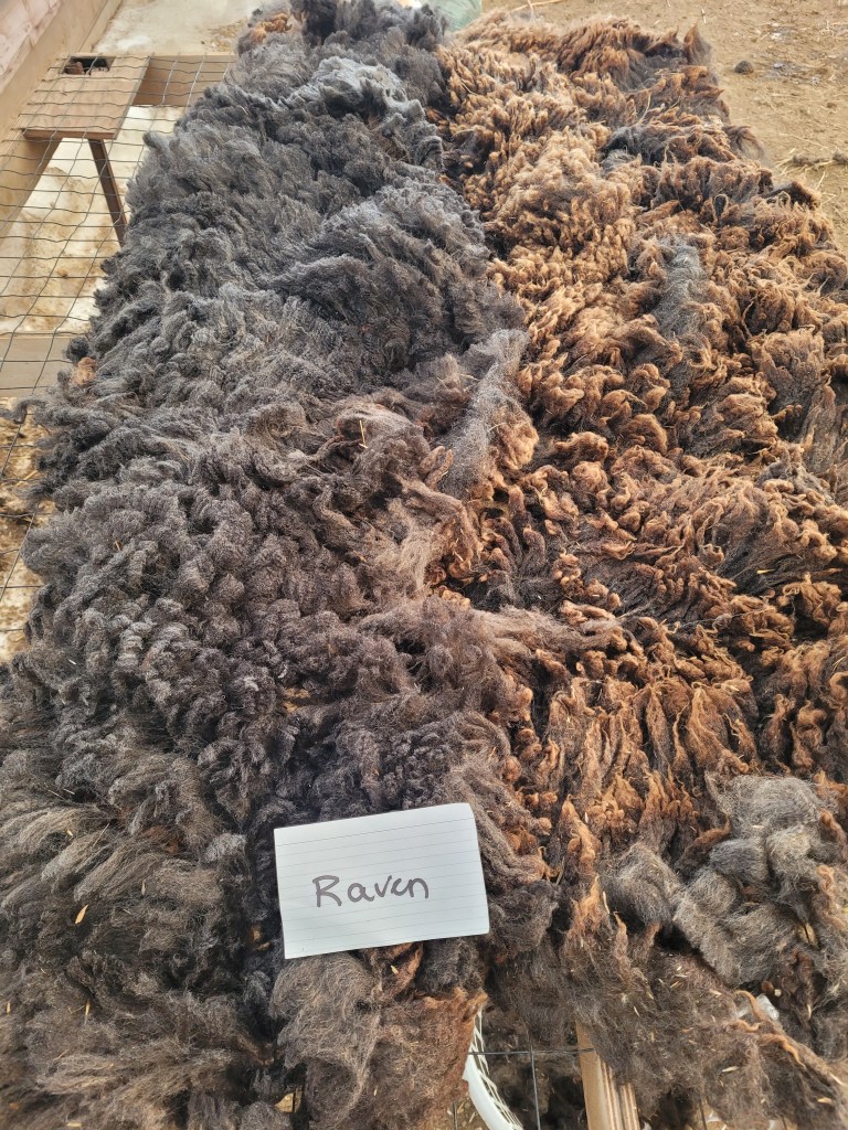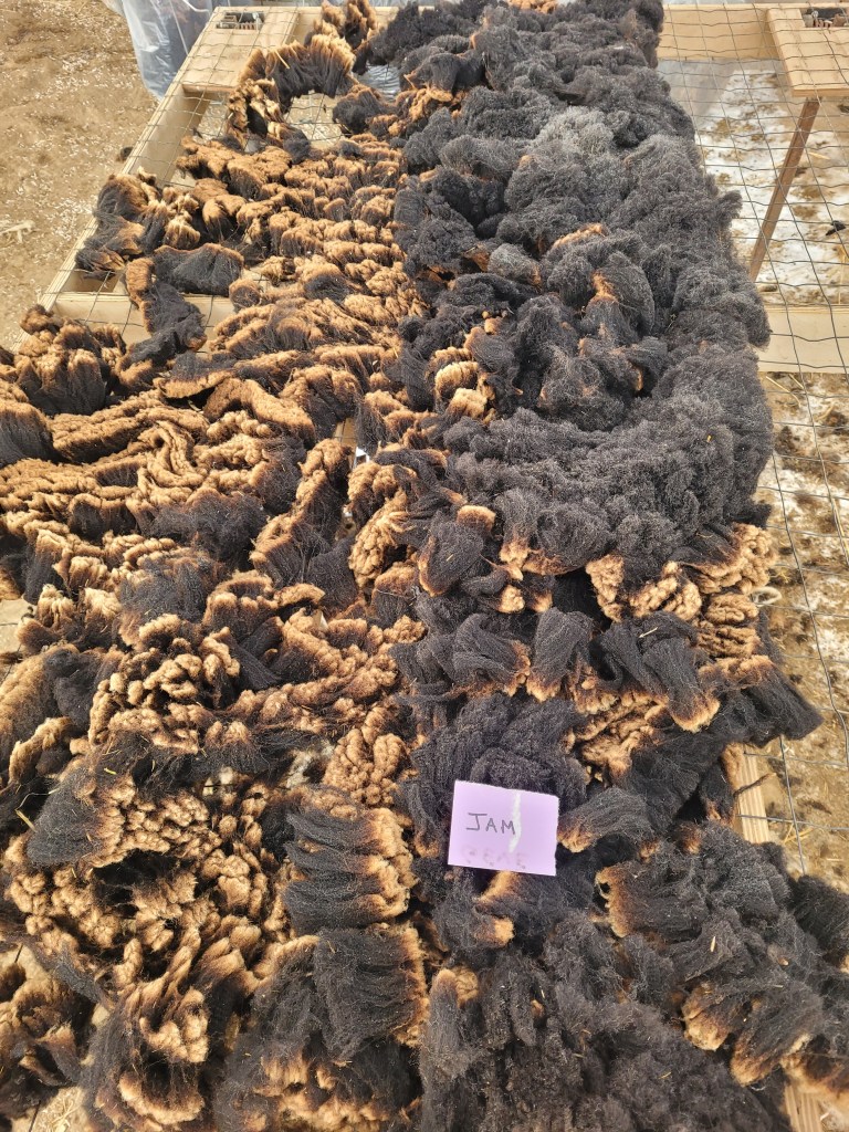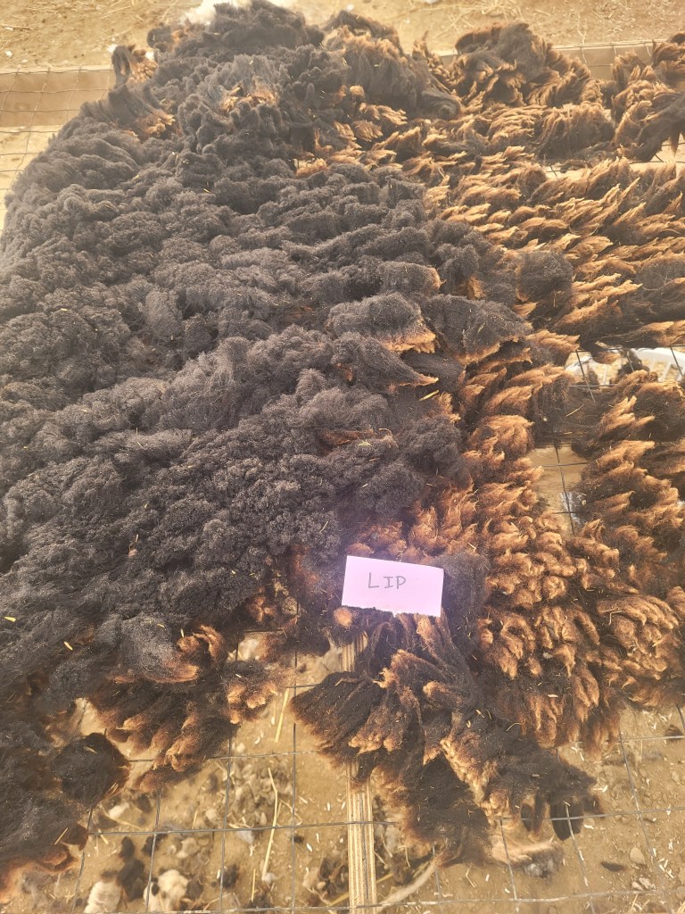 3 – 3 1/2″ staple. Even crimp, most well defined. Lofty and moderately soft. Down type. Black except sunbleached tips. Some VM 2lb 11oz $30
