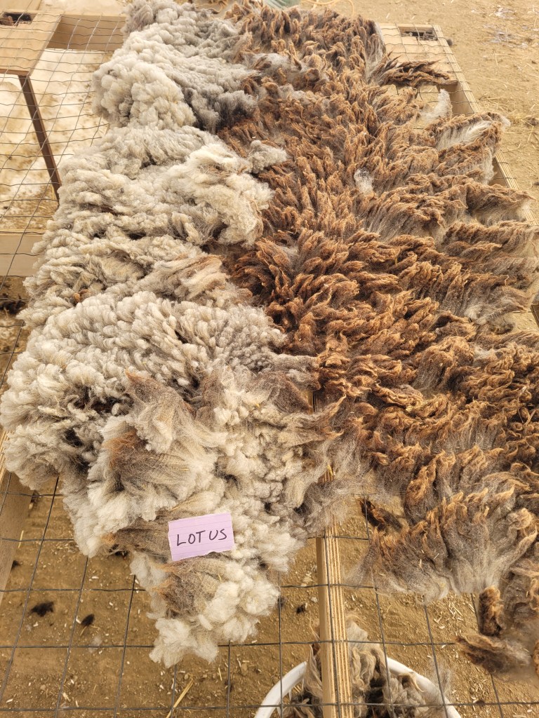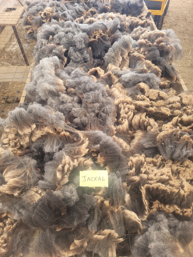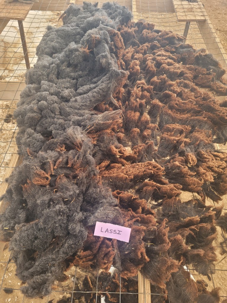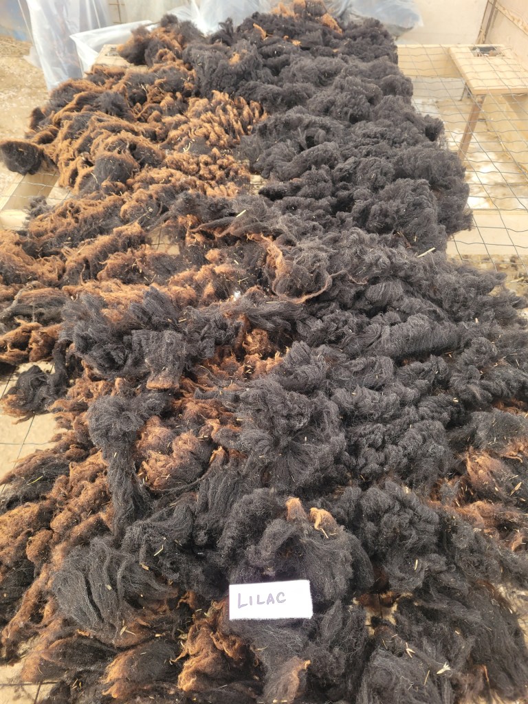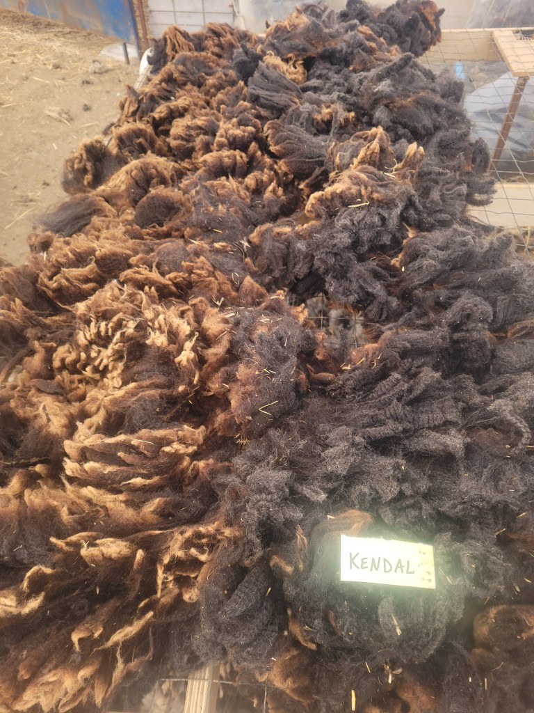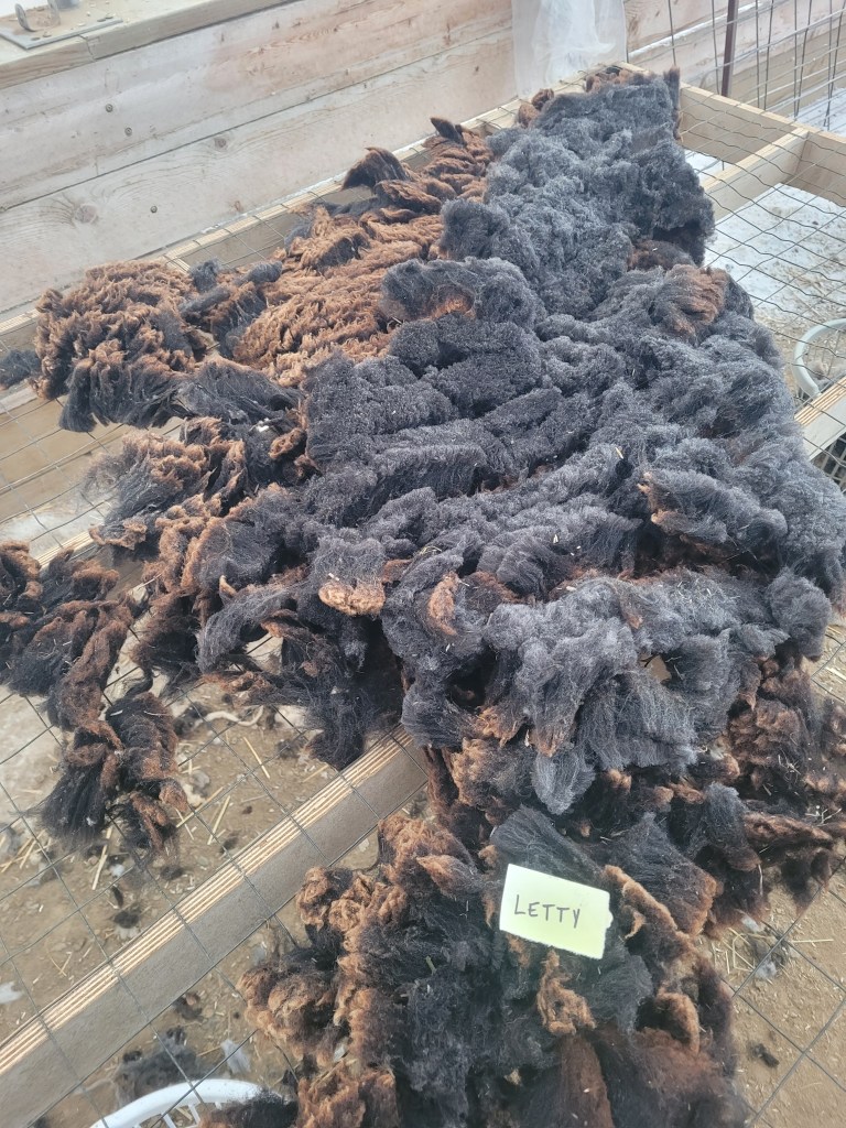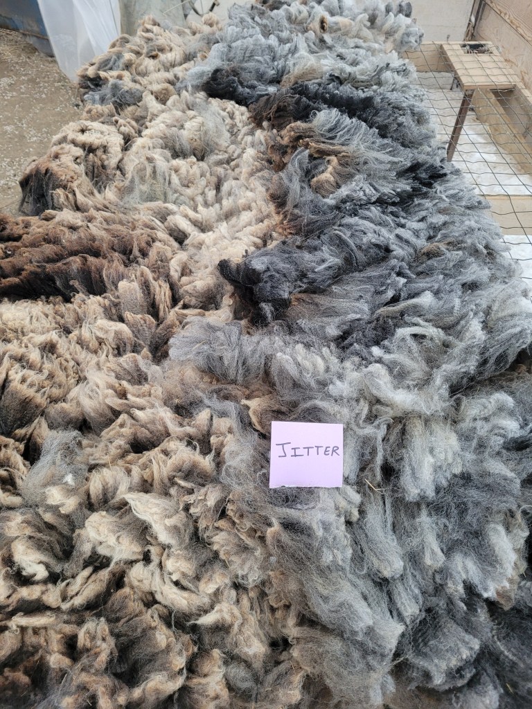 3 – 3 1/2″ staple. Even crimp, most well defined. Lofty and moderately soft. Down type. Black except sunbleached tips. Some VM 2lb 11oz $30