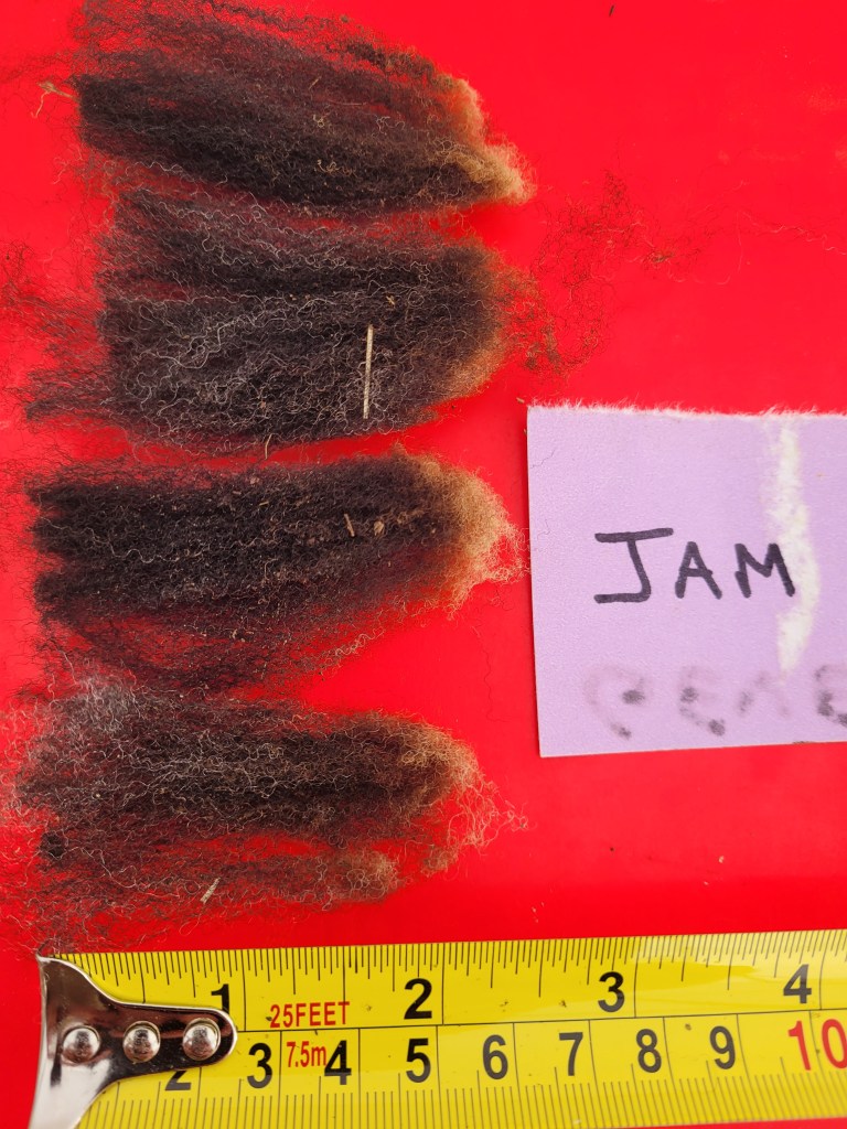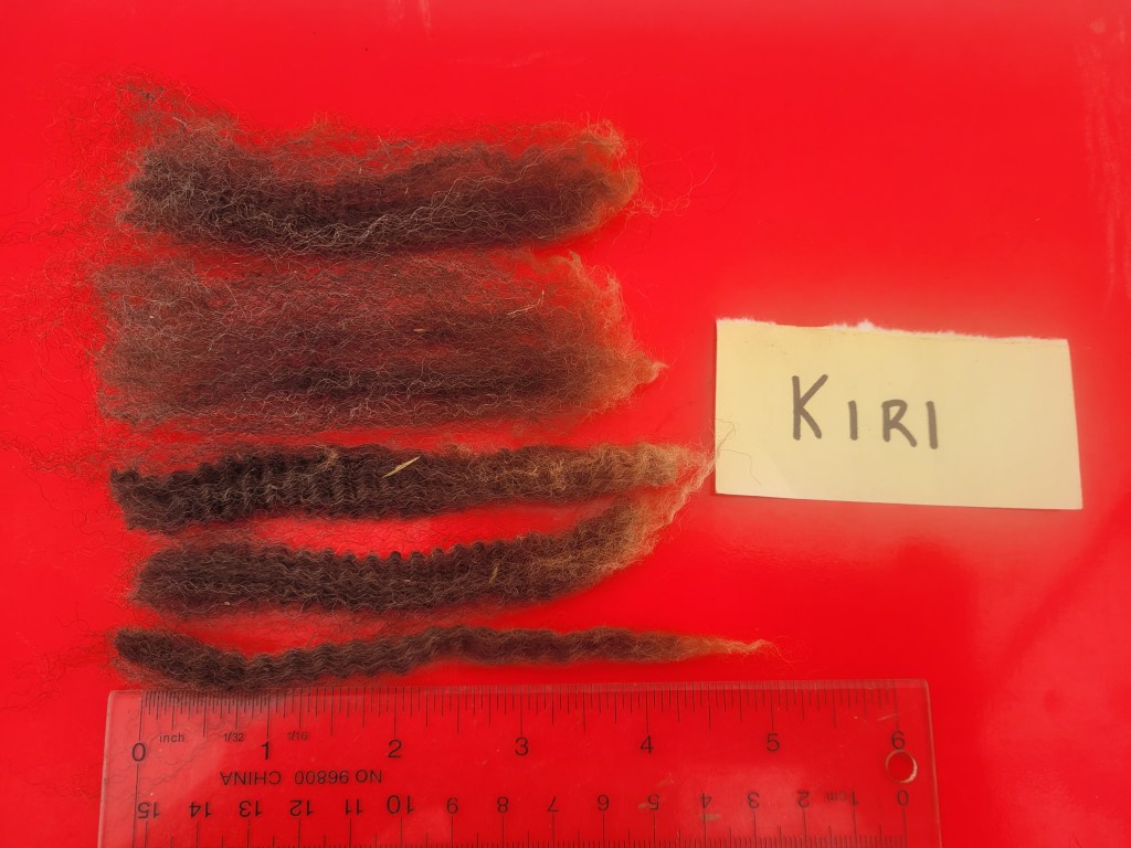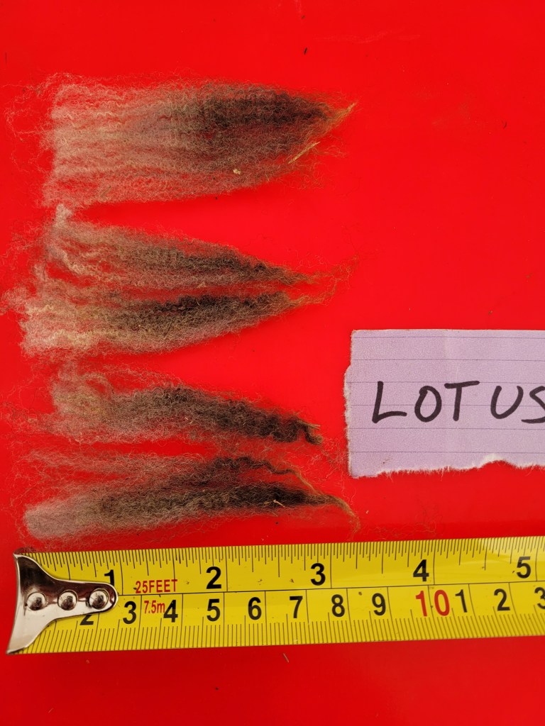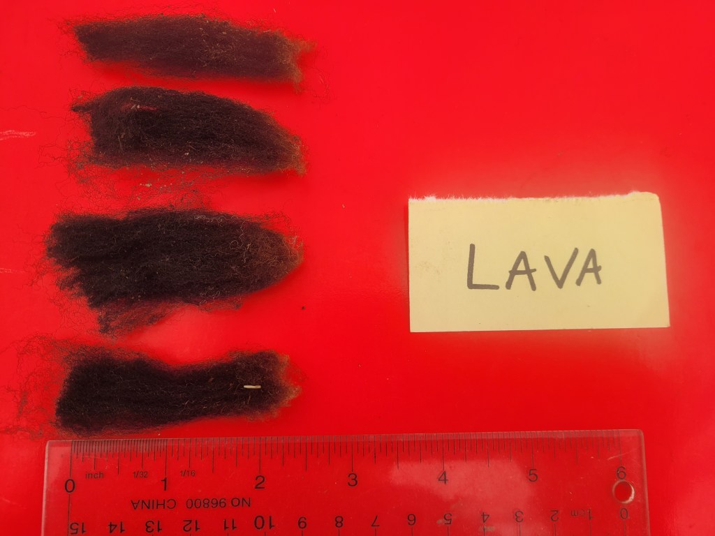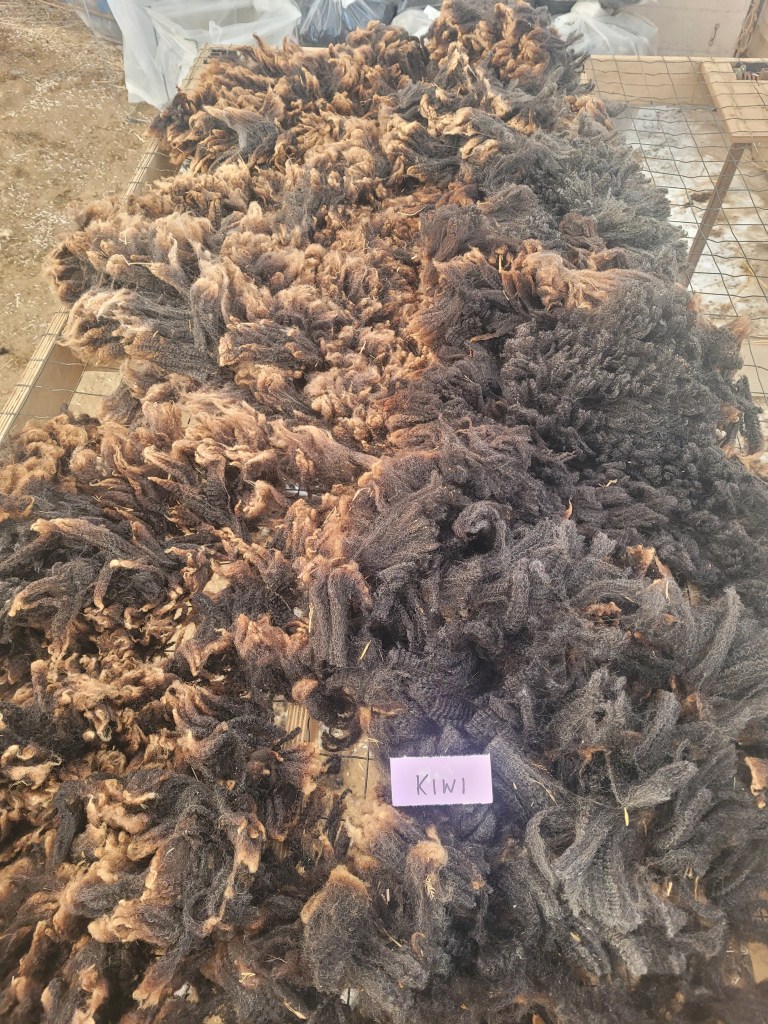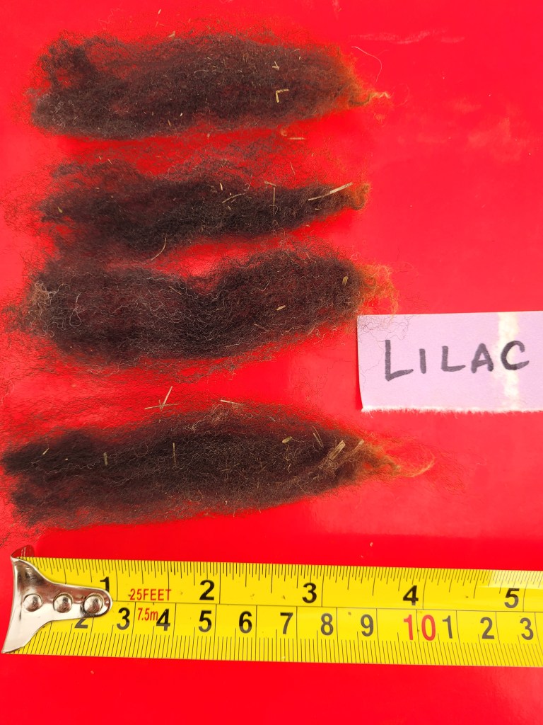 3 – 31/4″ staple. Wide, not well defined crimp. Lofty. Down type. Moderately soft handle. Course micron. Very dark grey (black and white fibres) with brown tips. Bit of VM and some parts slightly weak . 2lb 0oz $25