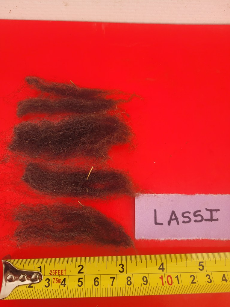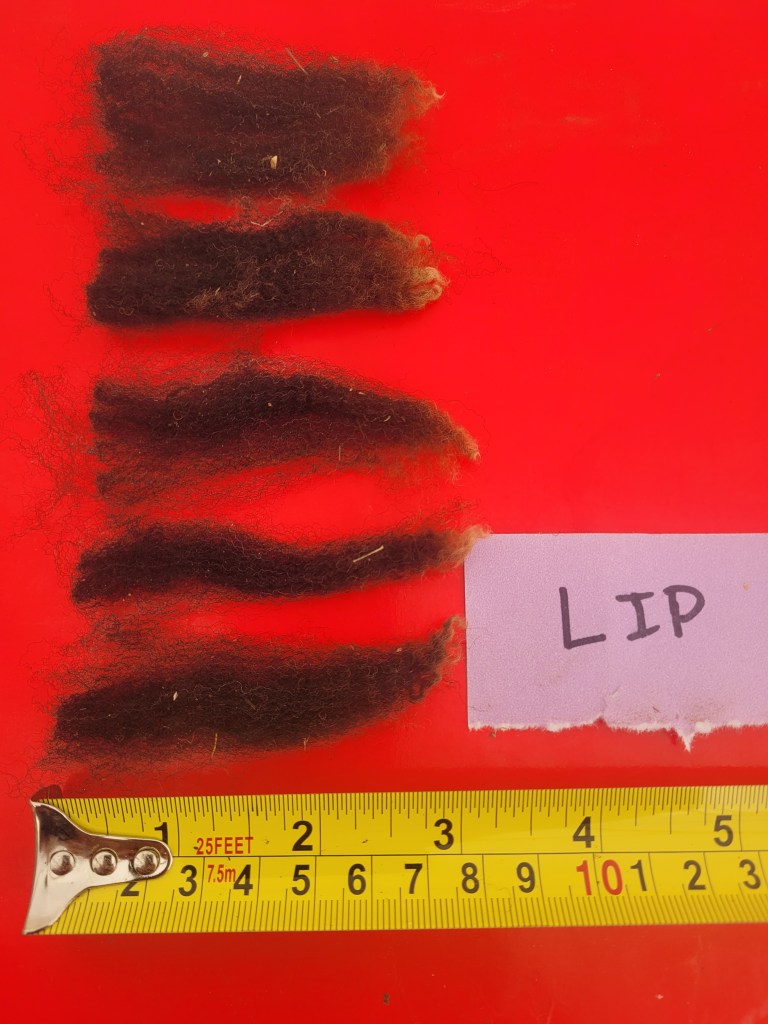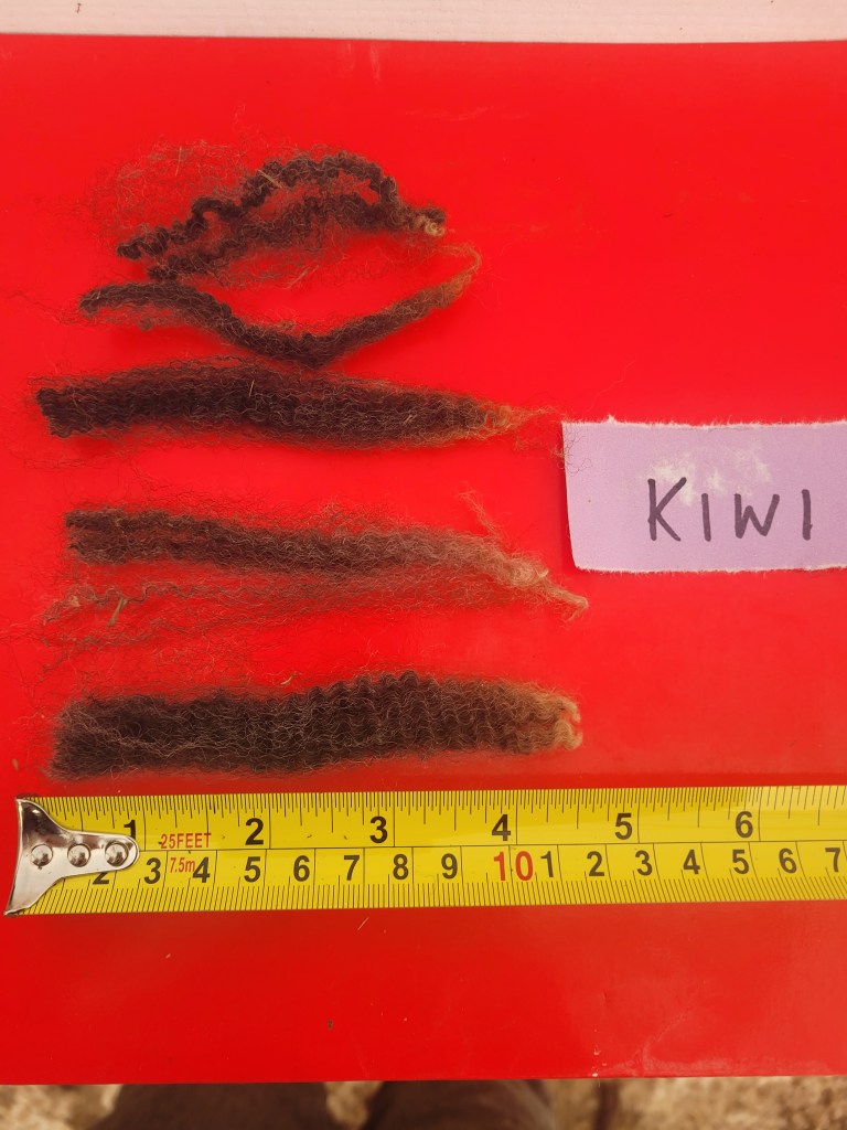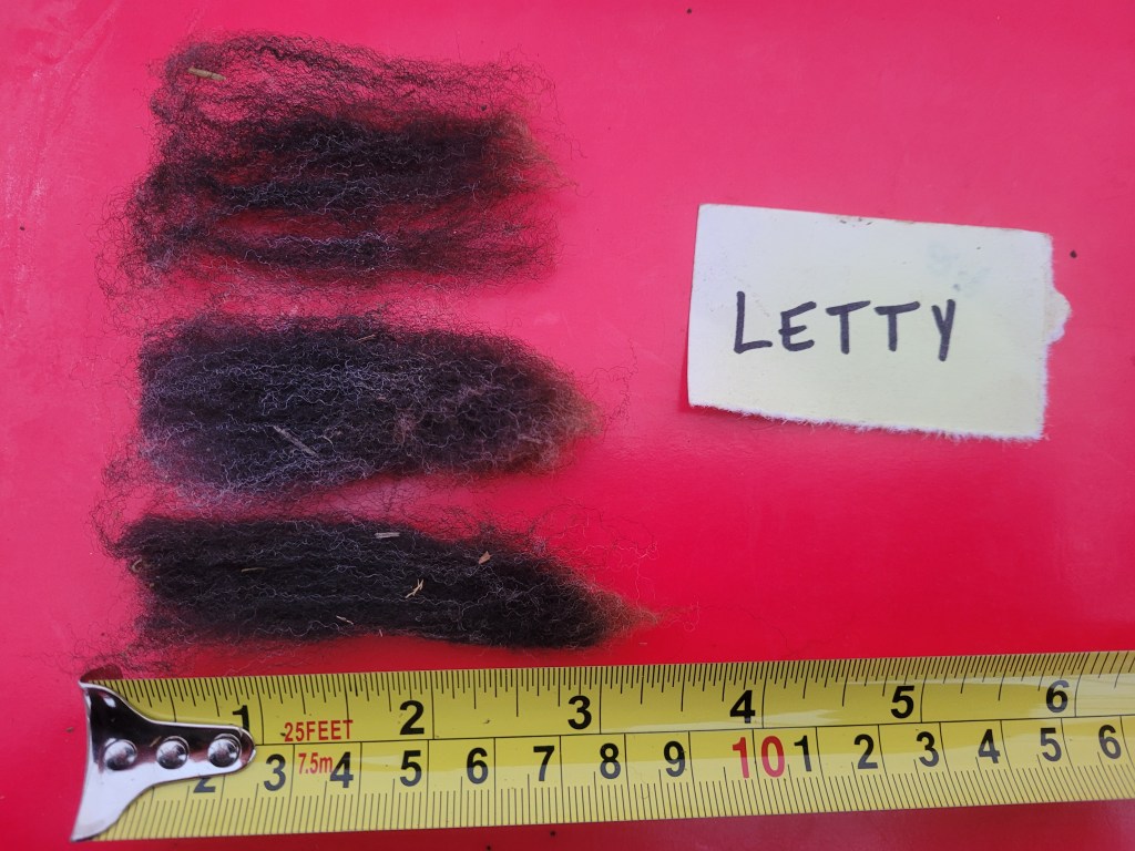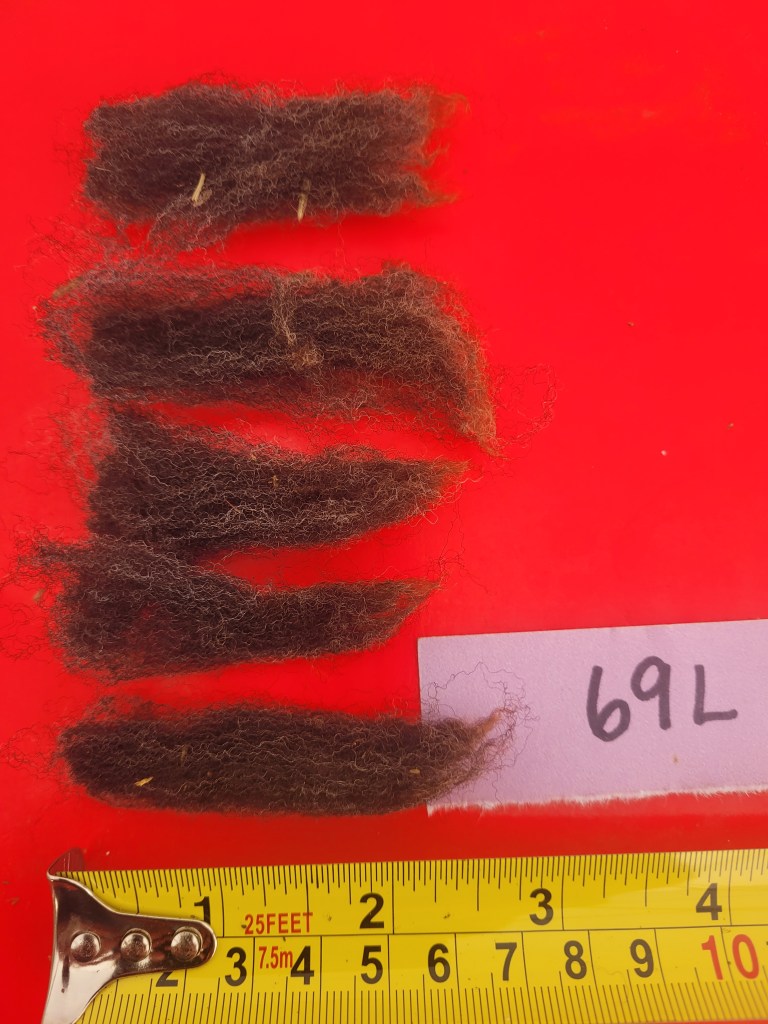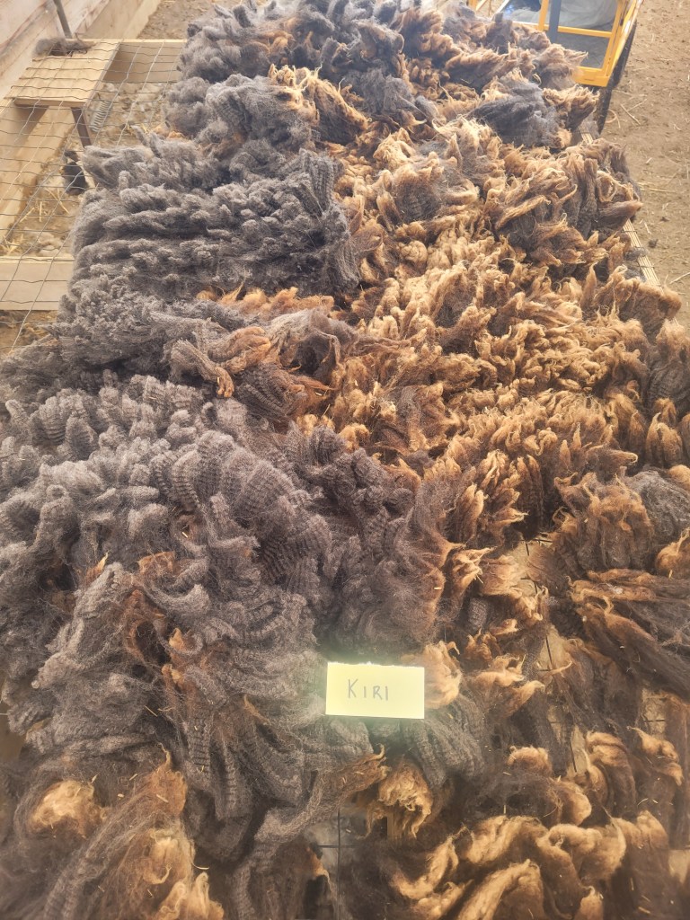 3 – 31/4″ staple. Wide, not well defined crimp. Lofty. Down type. Moderately soft handle. Course micron. Very dark grey (black and white fibres) with brown tips. Bit of VM and some parts slightly weak . 2lb 0oz $25