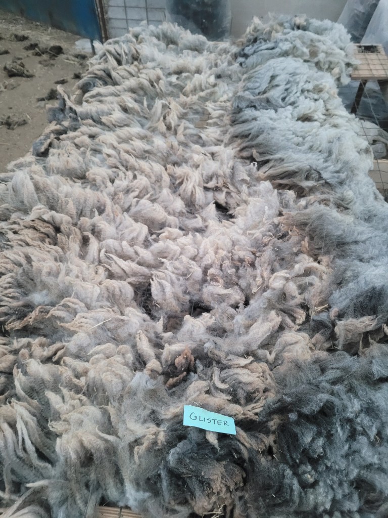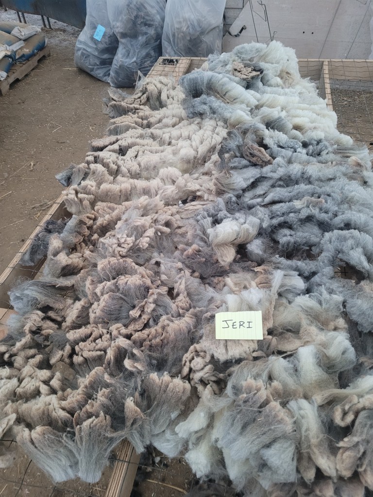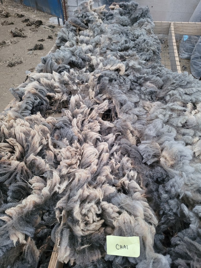 2 1/4 – 2 3/4″ staple. Even, fairly well defined crimp. Blocky, decently lofty. Moderately soft but courser micron. Dark grey – has black and white fibres. Some dandruff. 2lb 8oz $30