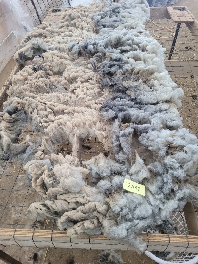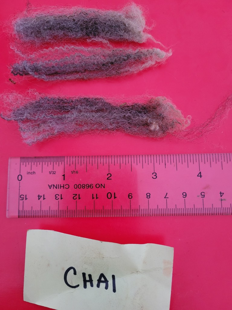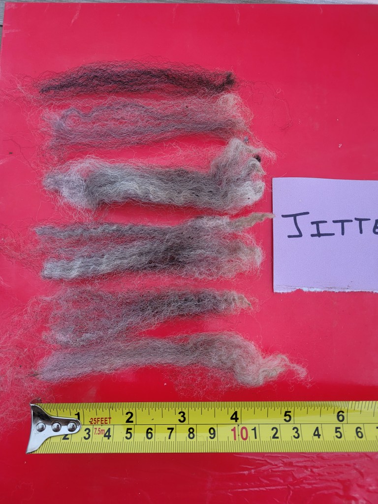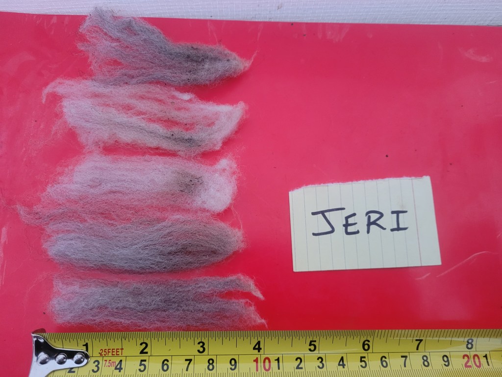 3 – 3 1/2″ staple. Fairly tight, well defined crimp. Soft. Tips somewhat weathered. Light grey to dark grey to brown throughout some locks, some just light grey. A bit of VM across the back (5%). 3lb 2oz $30