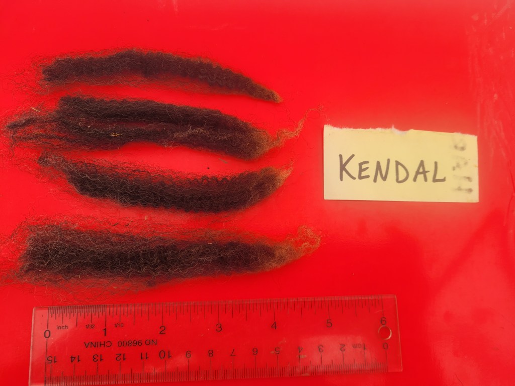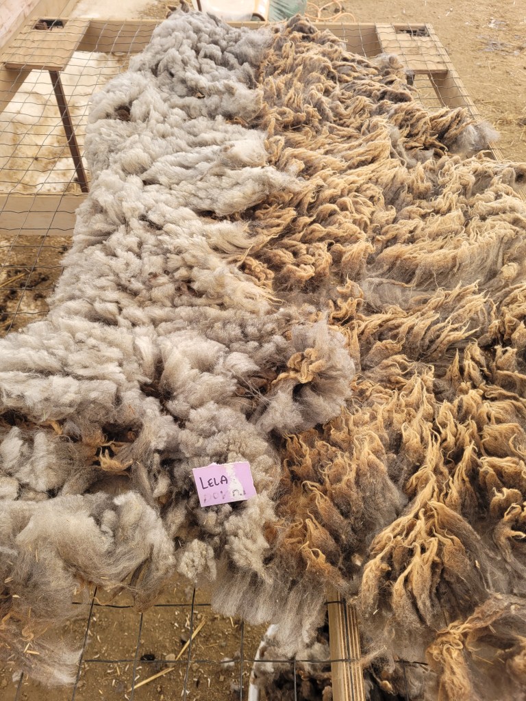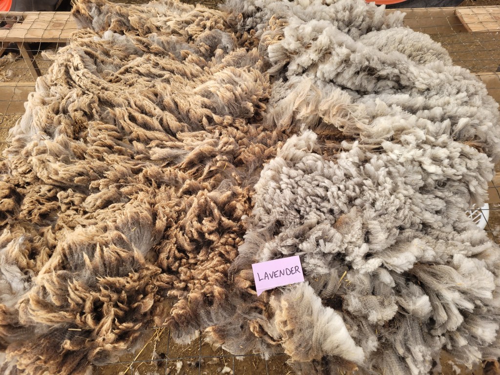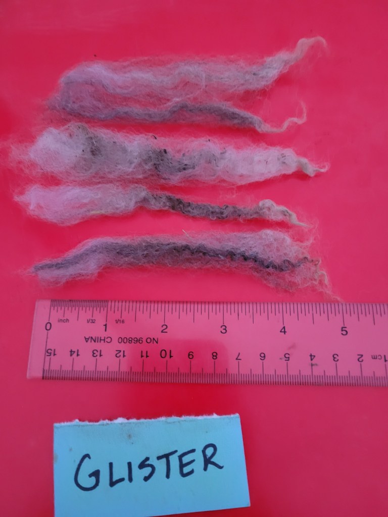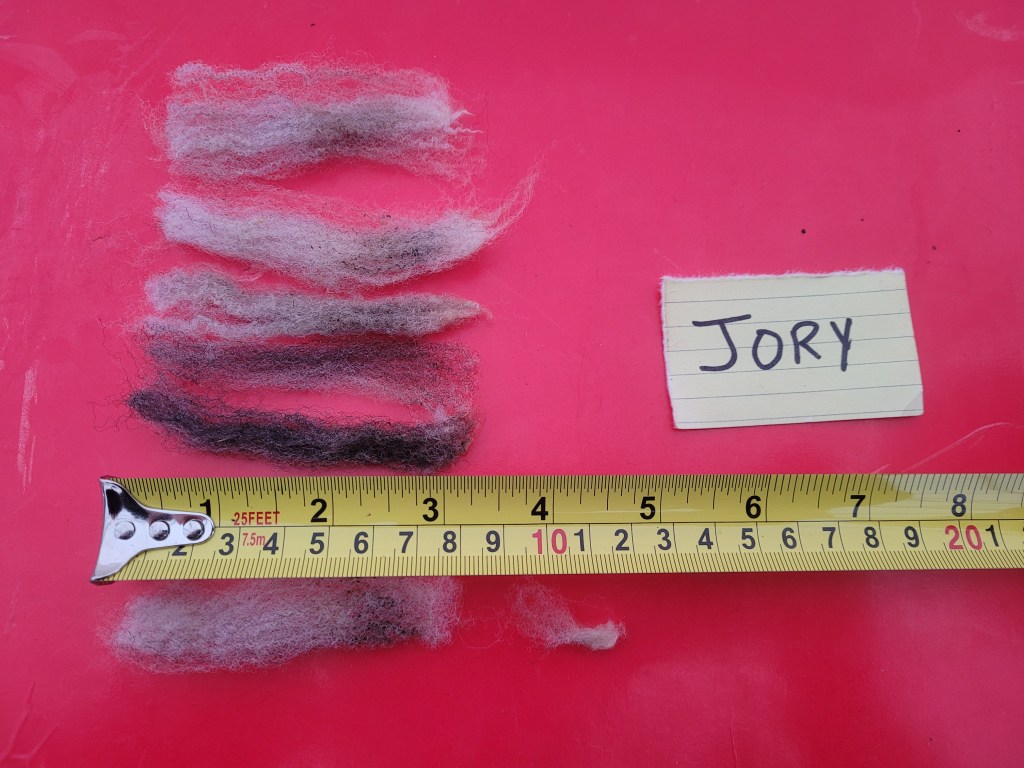 3 – 3 1/2″ staple. Fairly tight, well defined crimp. Soft. Tips somewhat weathered. Light grey to dark grey to brown throughout some locks, some just light grey. A bit of VM across the back (5%). 3lb 2oz $30