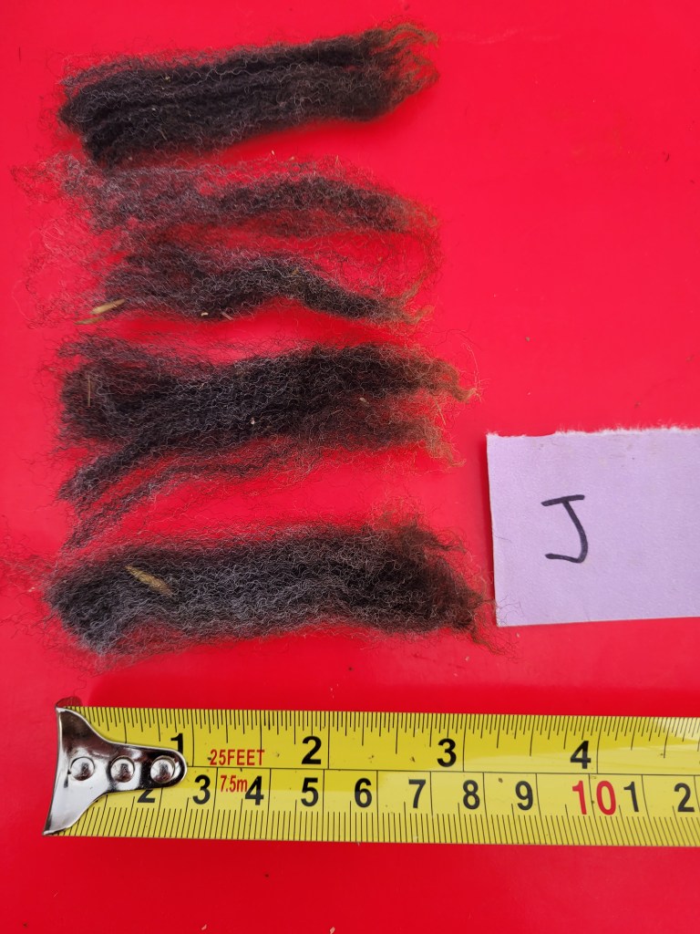 2 – 2 1/2″ staple. Even, fairly well defined crimp. Blocky and springy. Moderately soft. Black to dark grey. 4lb 1oz $40