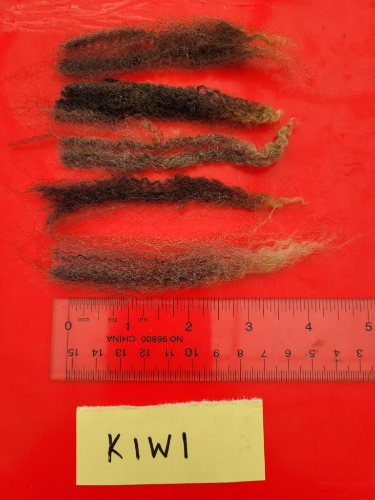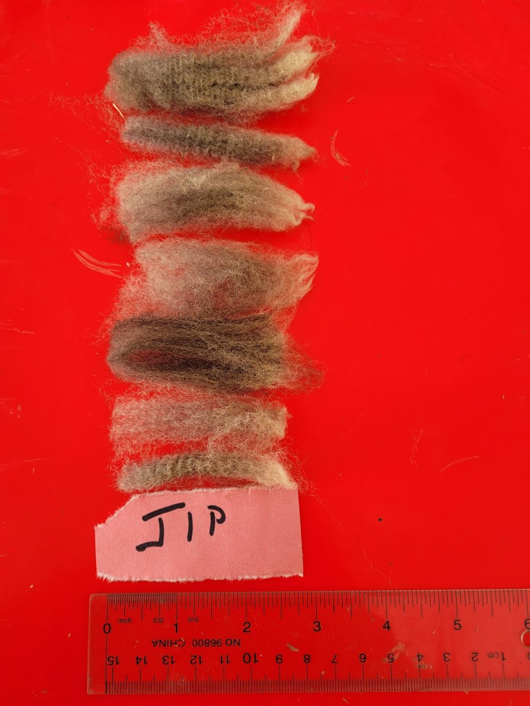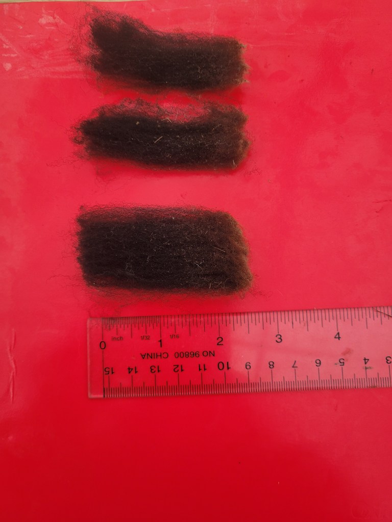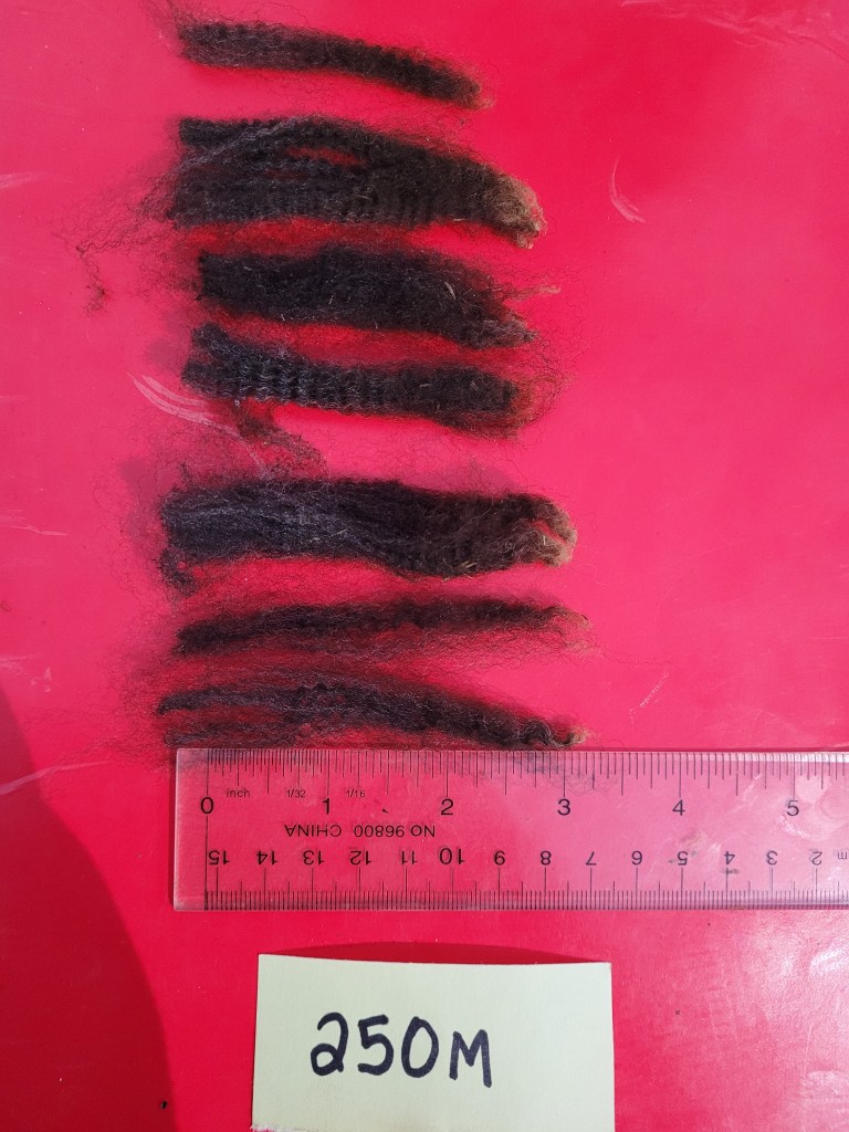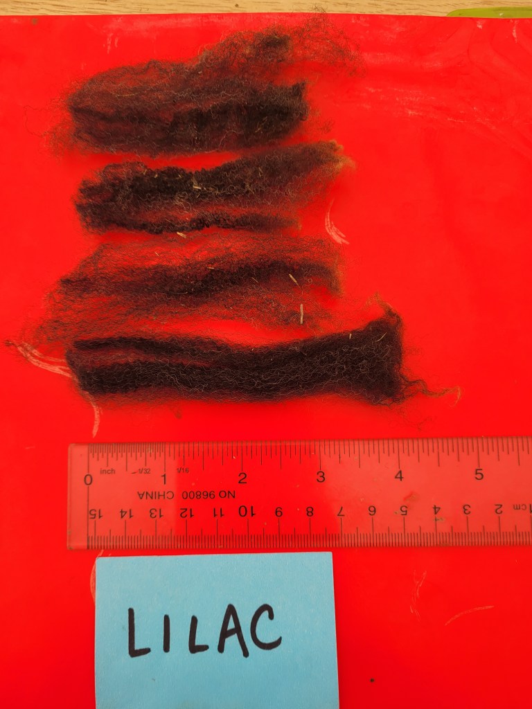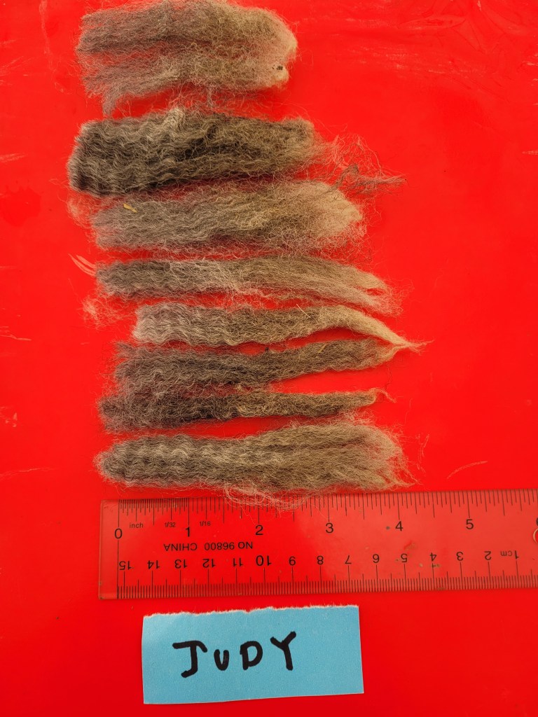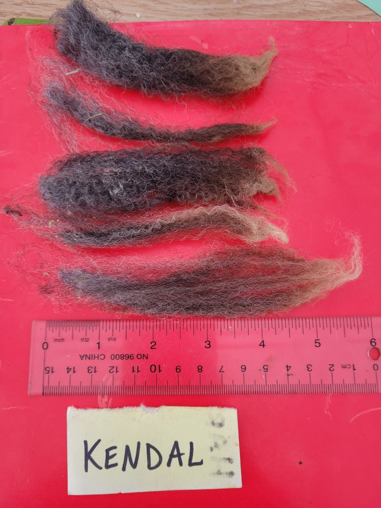 2 -3 ” staple. Not well defined and variable crimp – some wide and some tight. Variable and short. Even within the lock. Light grey to almost black. 2lb 6oz $25