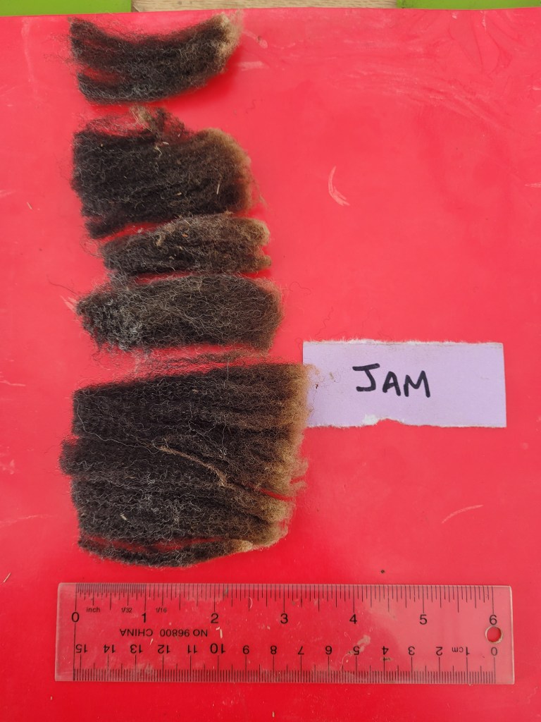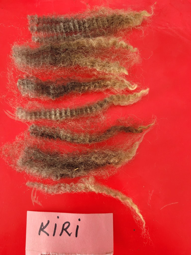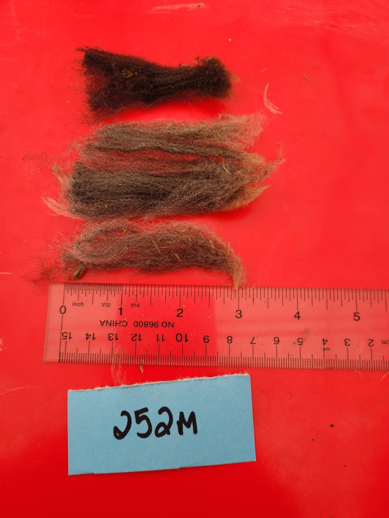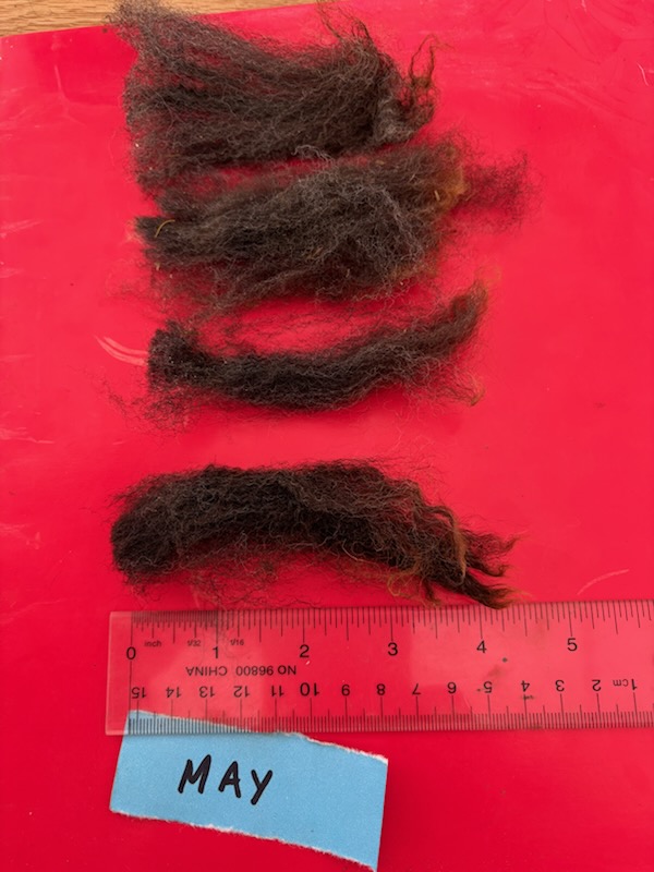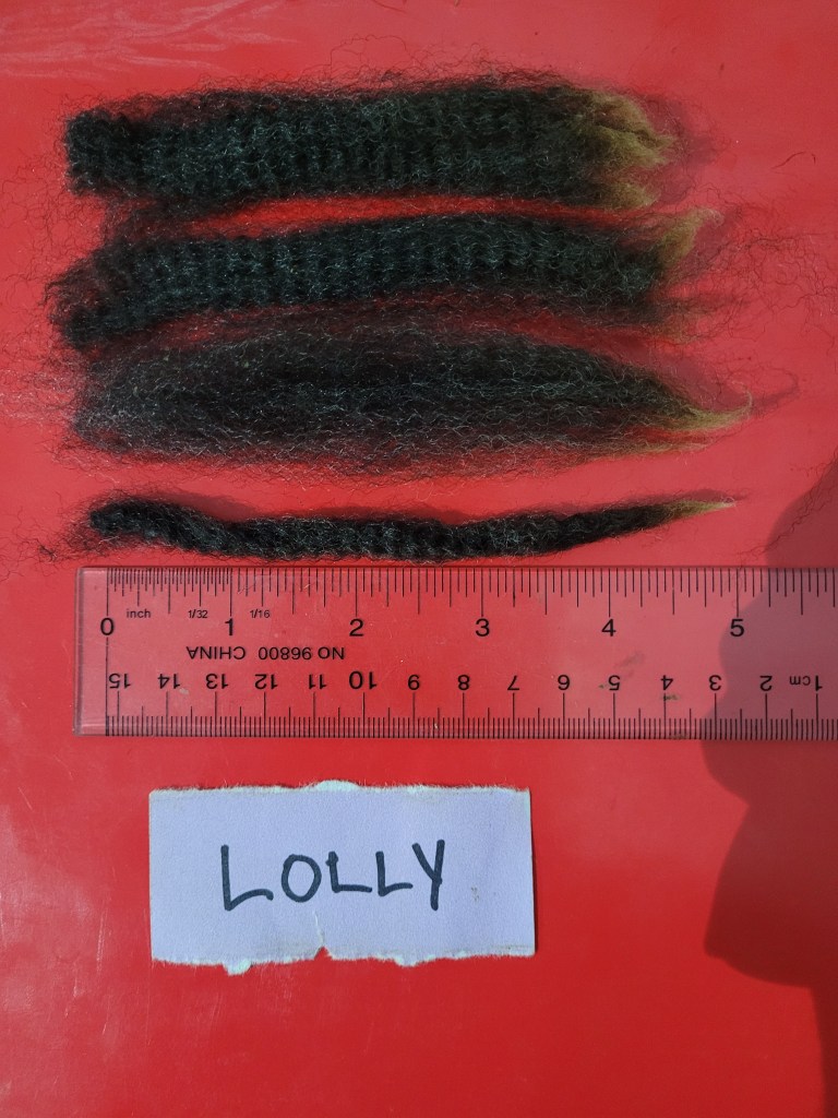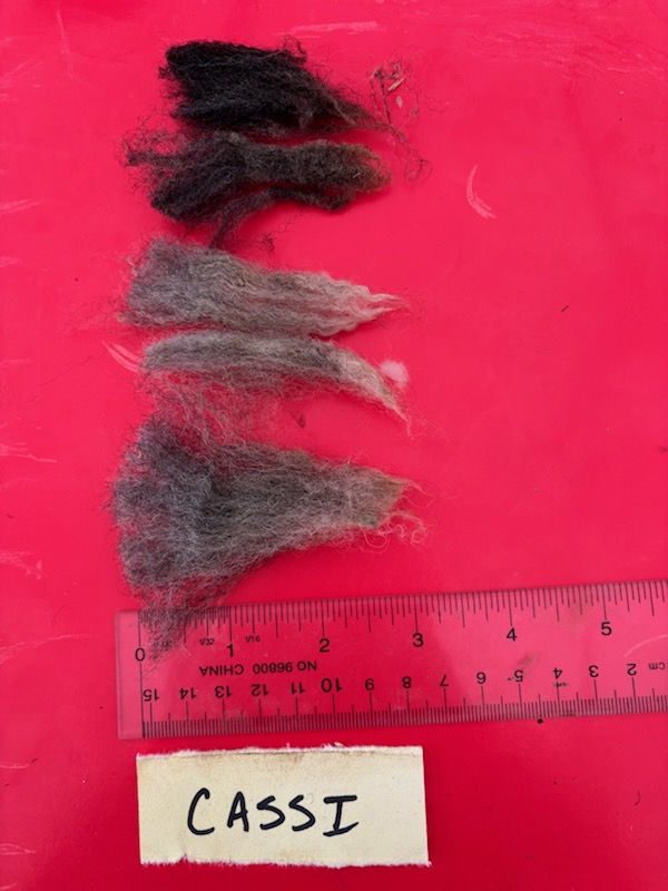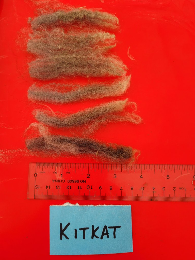 2 -3 ” staple. Not well defined and variable crimp – some wide and some tight. Variable and short. Even within the lock. Light grey to almost black. 2lb 6oz $25