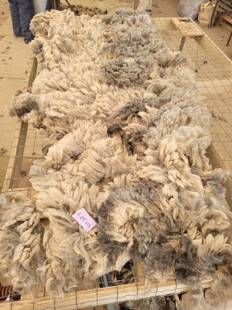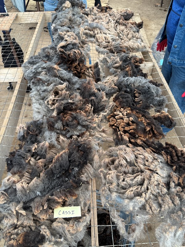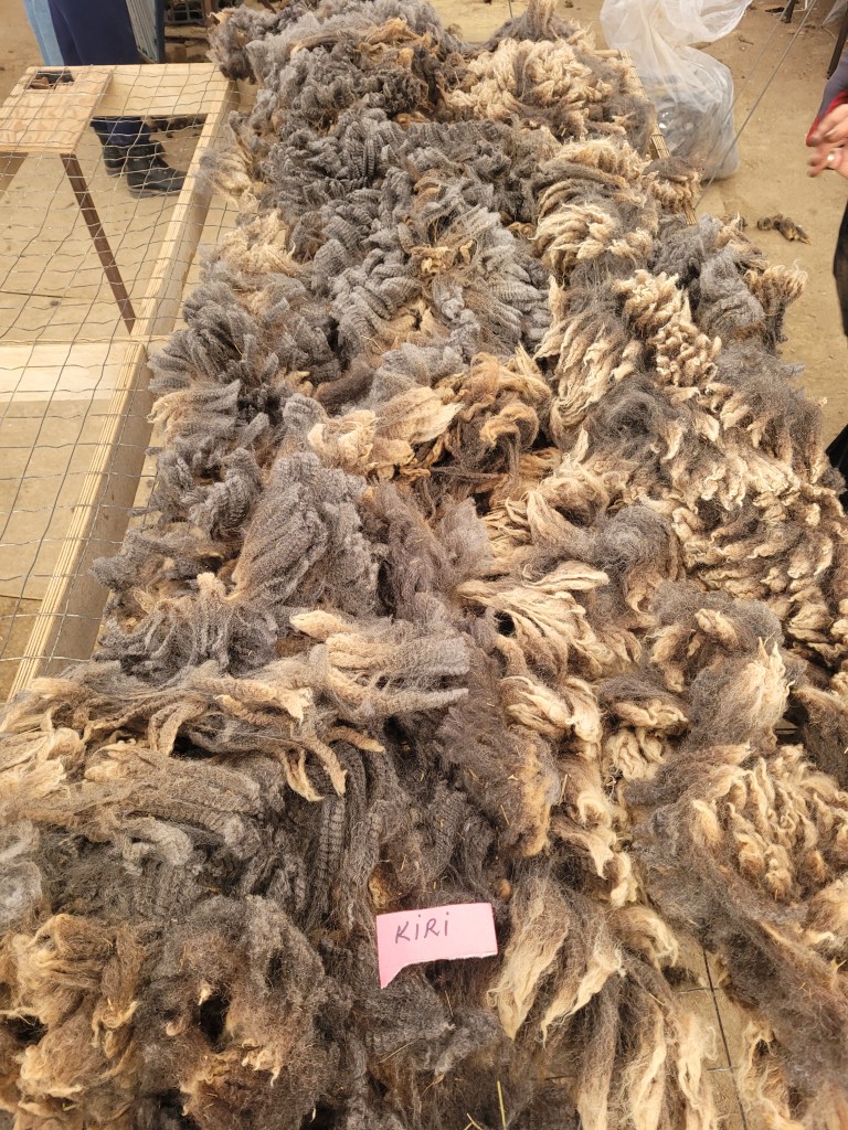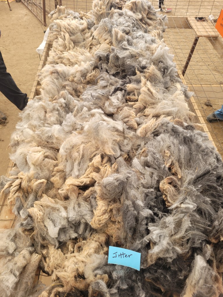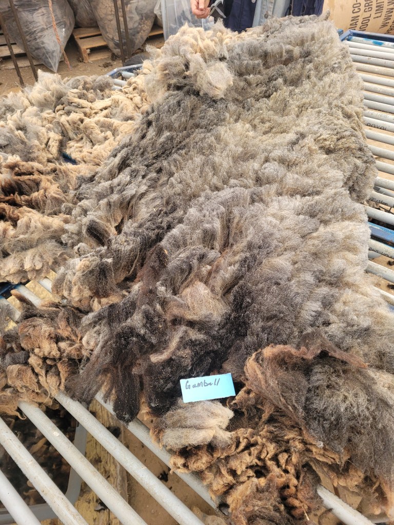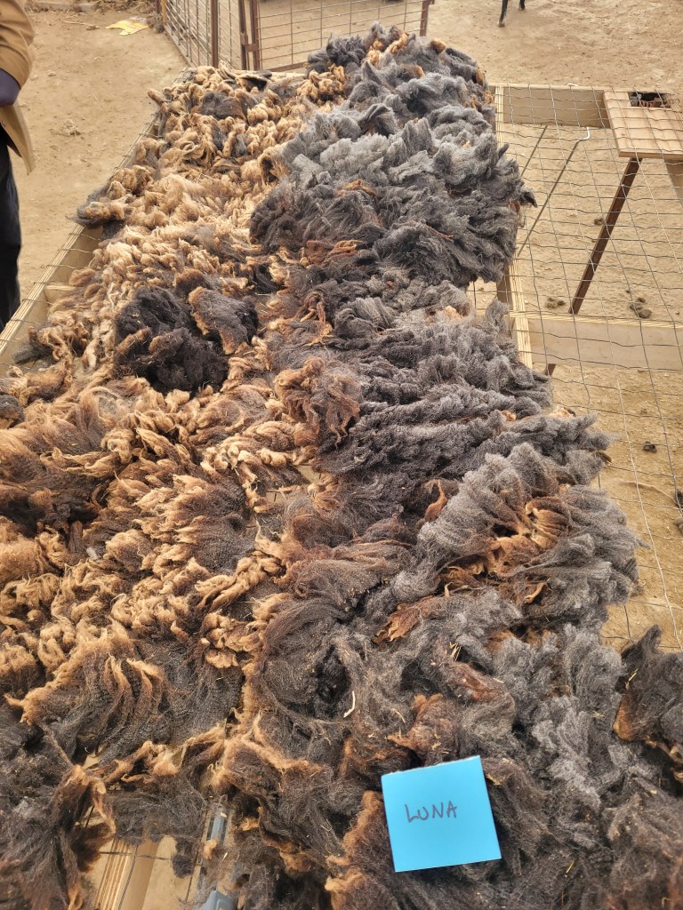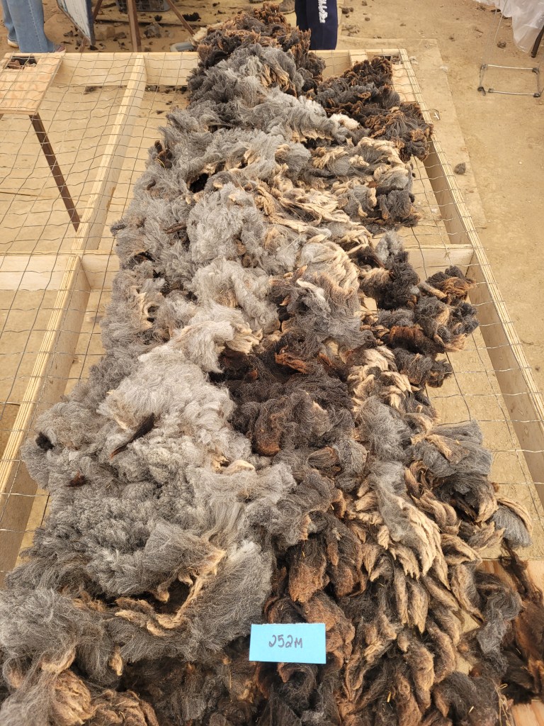 3 1/2 – 4 1/2″ staple. Very wide/open crimp. Fairly even. A bit of luster. Course. Mostly medium grey, some dark. Top 1″ sunbleached brown. 6lb 0oz $45