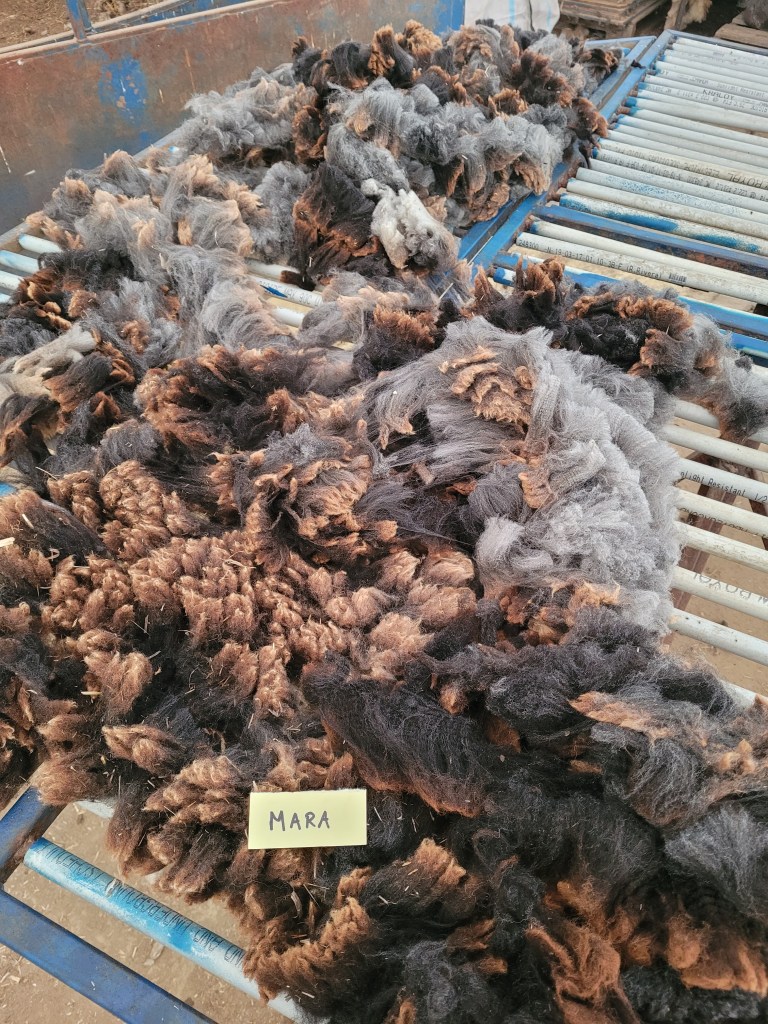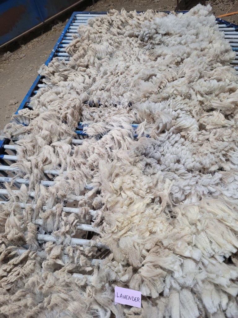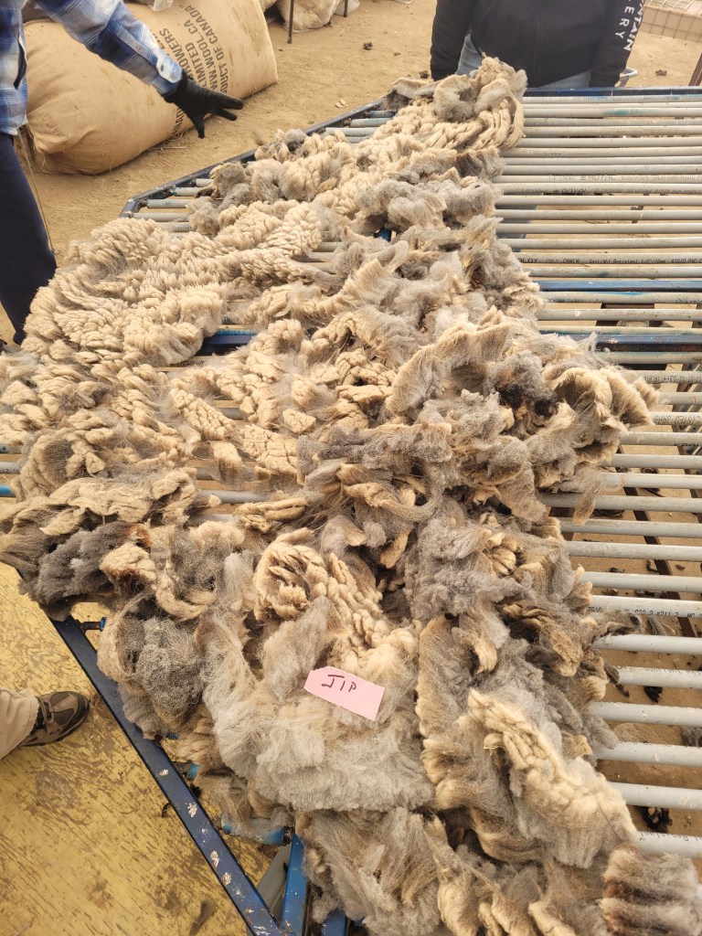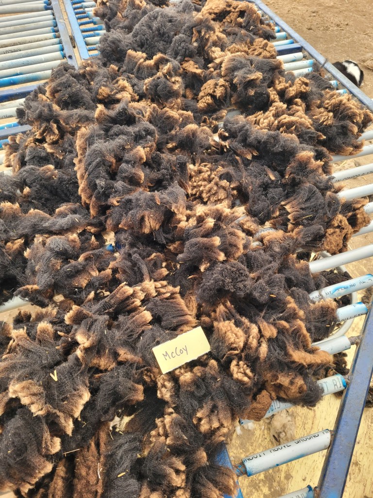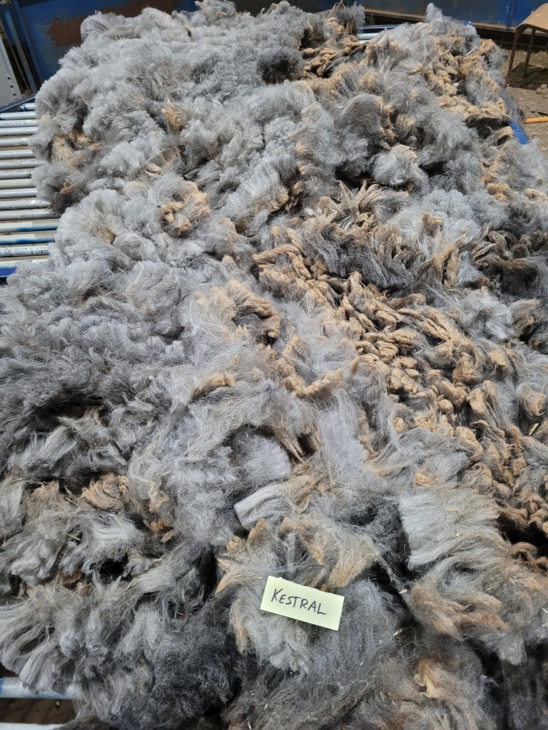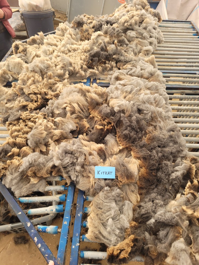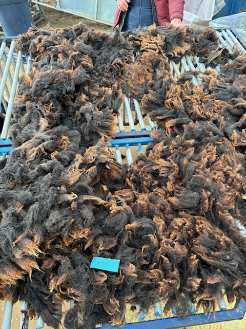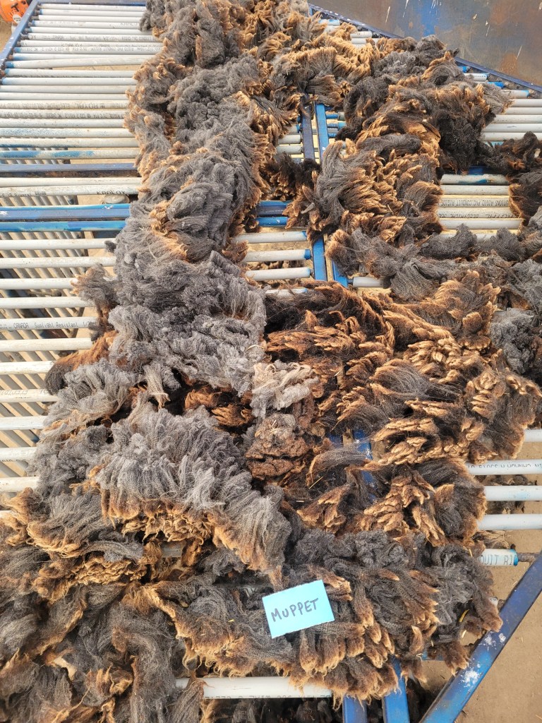 3 1/2 – 4 1/2″ staple. Very wide/open crimp. Fairly even. A bit of luster. Course. Mostly medium grey, some dark. Top 1″ sunbleached brown. 6lb 0oz $45