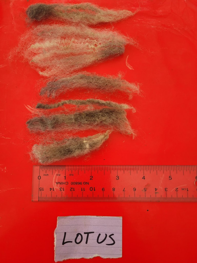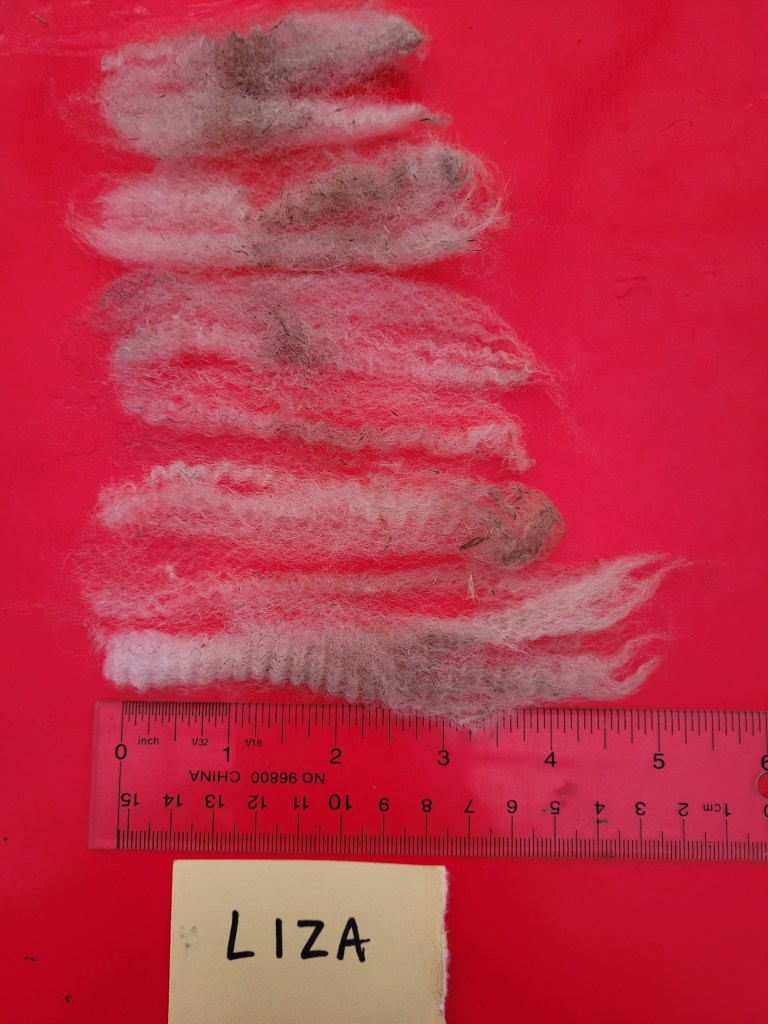 4 – 5″ staple. Mostly well defined crimp. Fairly even within the lock. A bit of luster. Light to medium to dark grey. Feels softish. Some VM – bigger pieces. 5lb 0oz $60