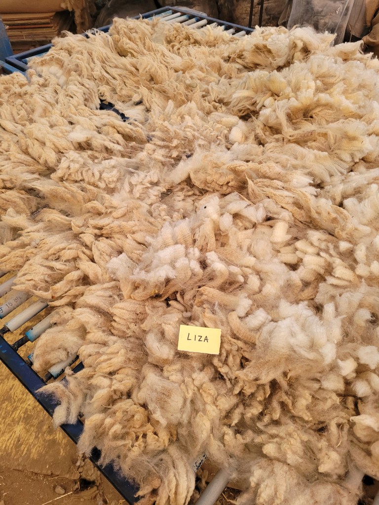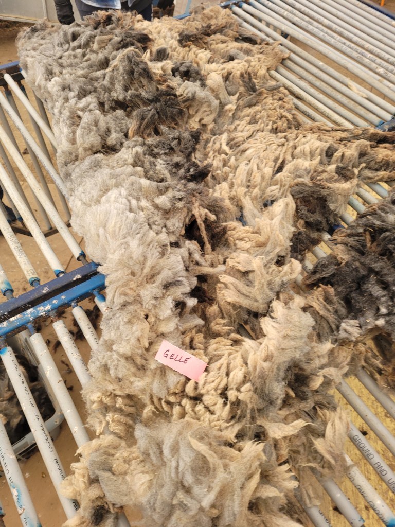 3 3/4″ staple. Even, not well defined crimp. Lofty. Even fleece. Fairly clean. Mostly light to medium grey. Course. Mild to moderate ram smell. Typical of the cross. 6lb 10oz $60