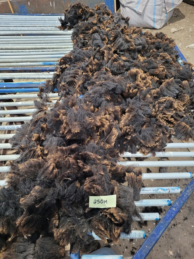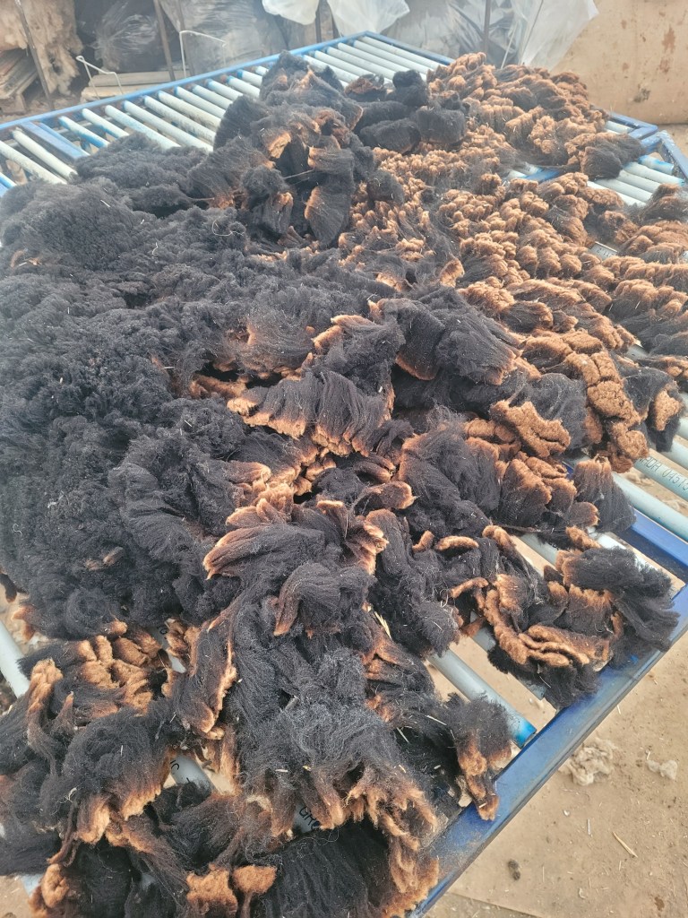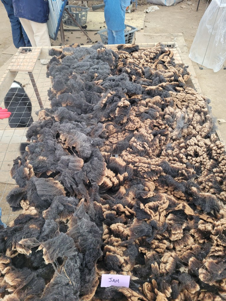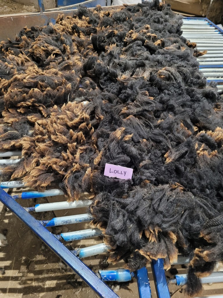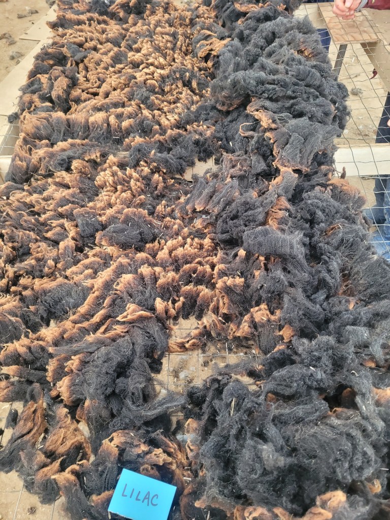 2 3/4″ staple. Even, tight crimp. Blocky, down type. Fairly course. Black except sunbleached tips. Tips are weak/weathered. 3lb 4oz $30