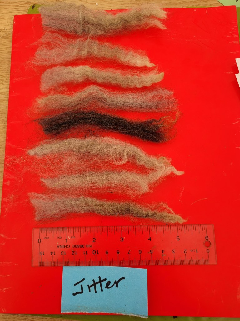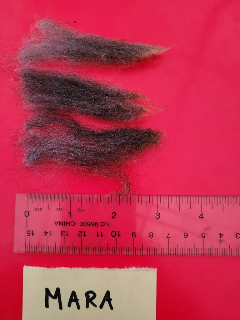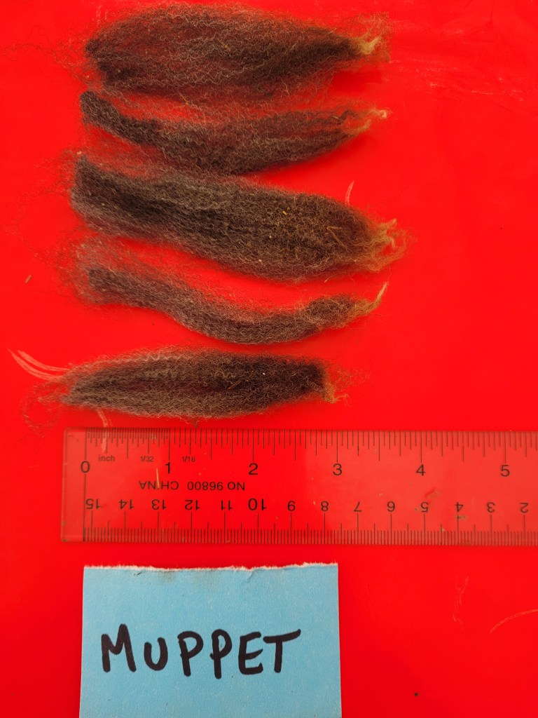 2 1/2 – 3 1/2″ staple. Mostly well defined and even crimp. Lustrous/some grease. Some loft and fairly soft. Very dark grey with brown tips. A bit jumbled, some 2nd cuts may have been missed. 3lb 13oz $45