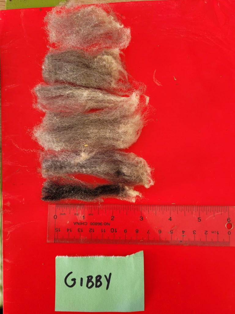 3 – 4 1/2 ” staple. Fairly well defined, open, even crimp. Length is variable. Even within the lock. Medium grey with some darker along the edges. Sunbleached tips. Some dandruff. 4lb 7oz $50