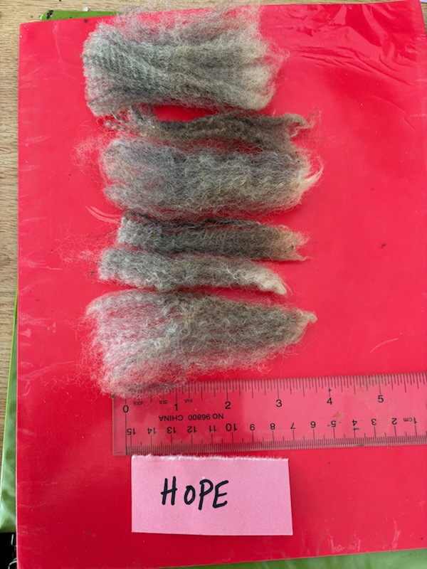 3 – 3 1/2 ” staple. Even, well defined crimp. Fairly even through lock and fleece. Romney type. Light to medium grey. 4lb 7oz $55