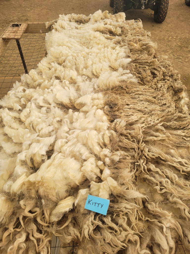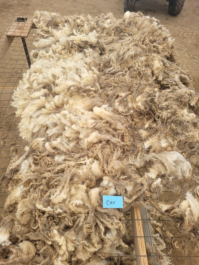 8 – 8 1/2″ staple. Wide, well defined crimp. Lustrous. Moderately soft for a strong/course type wool. Some large pieces of VM along the back. Some cotting along the sides but will pull apart. Moderately greasy. 7lb 3oz $60