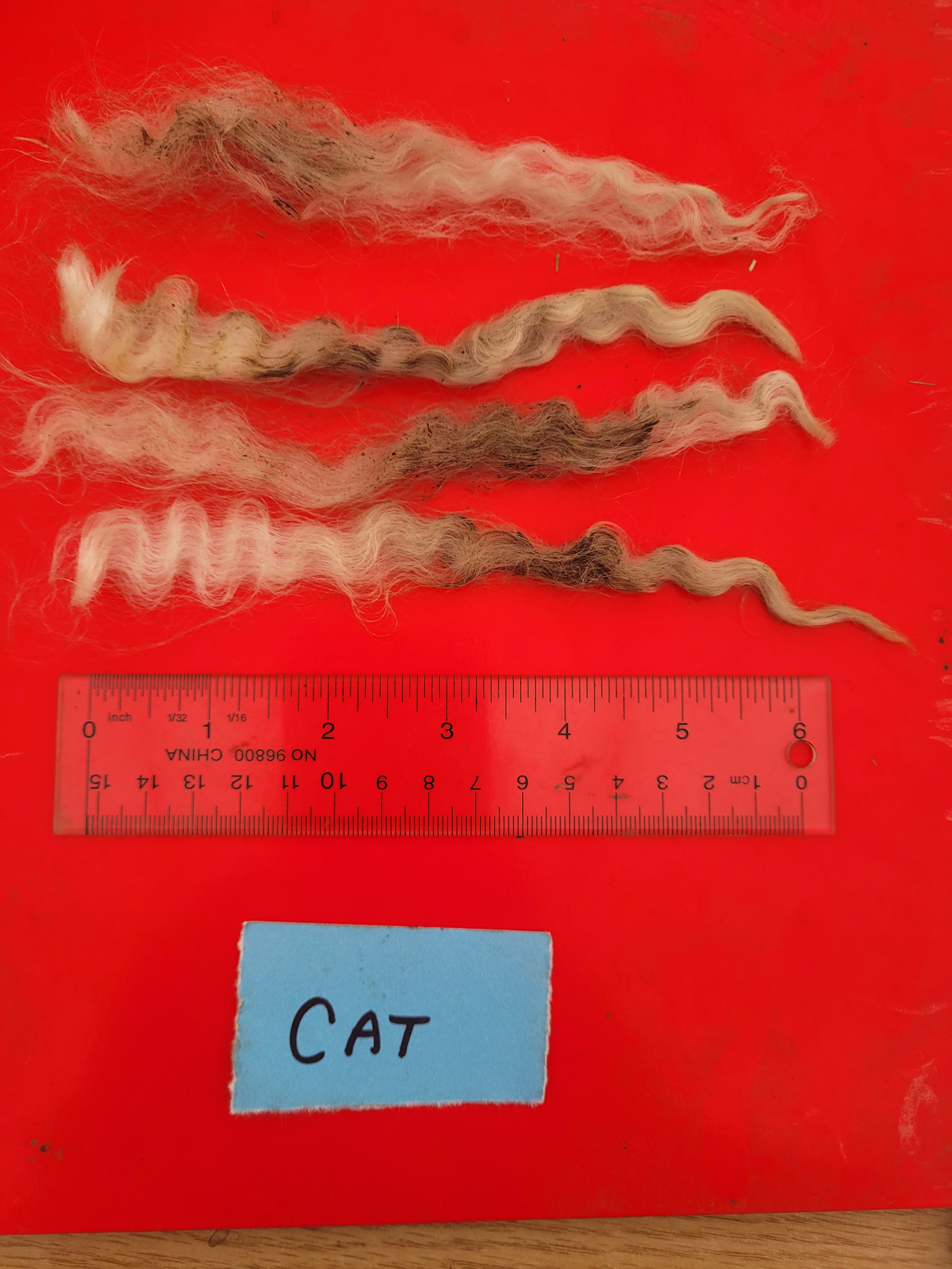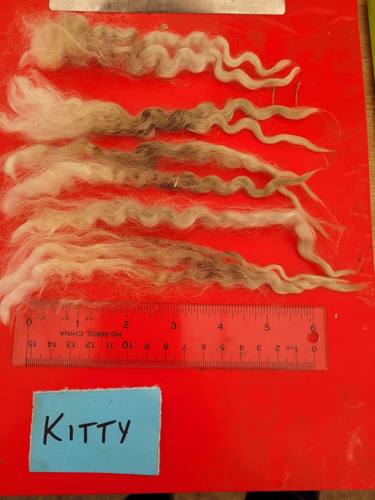 6 – 7″ staple. Wide, even crimp. Lustrous. Minimal VM (most of the back taken out), lots of grease. Somewhat airy once the grease is out. Some cotting on the sides. 9lb 3oz $60