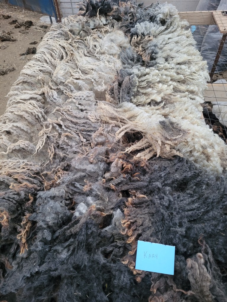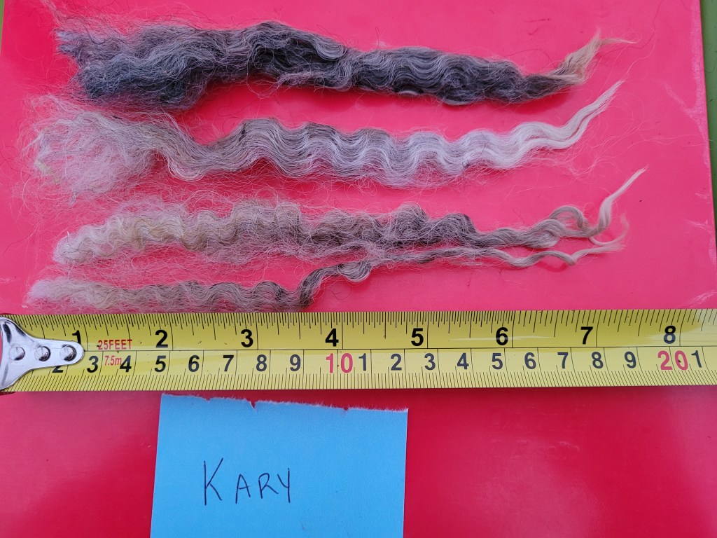 7 1/2 – 8″ staple. Wide, wavy, well defined crimp. Has luster and drape. Dark to light grey. Fairly greasy, some dandruff. A bit of big VM pieces. 7lb 4oz $65