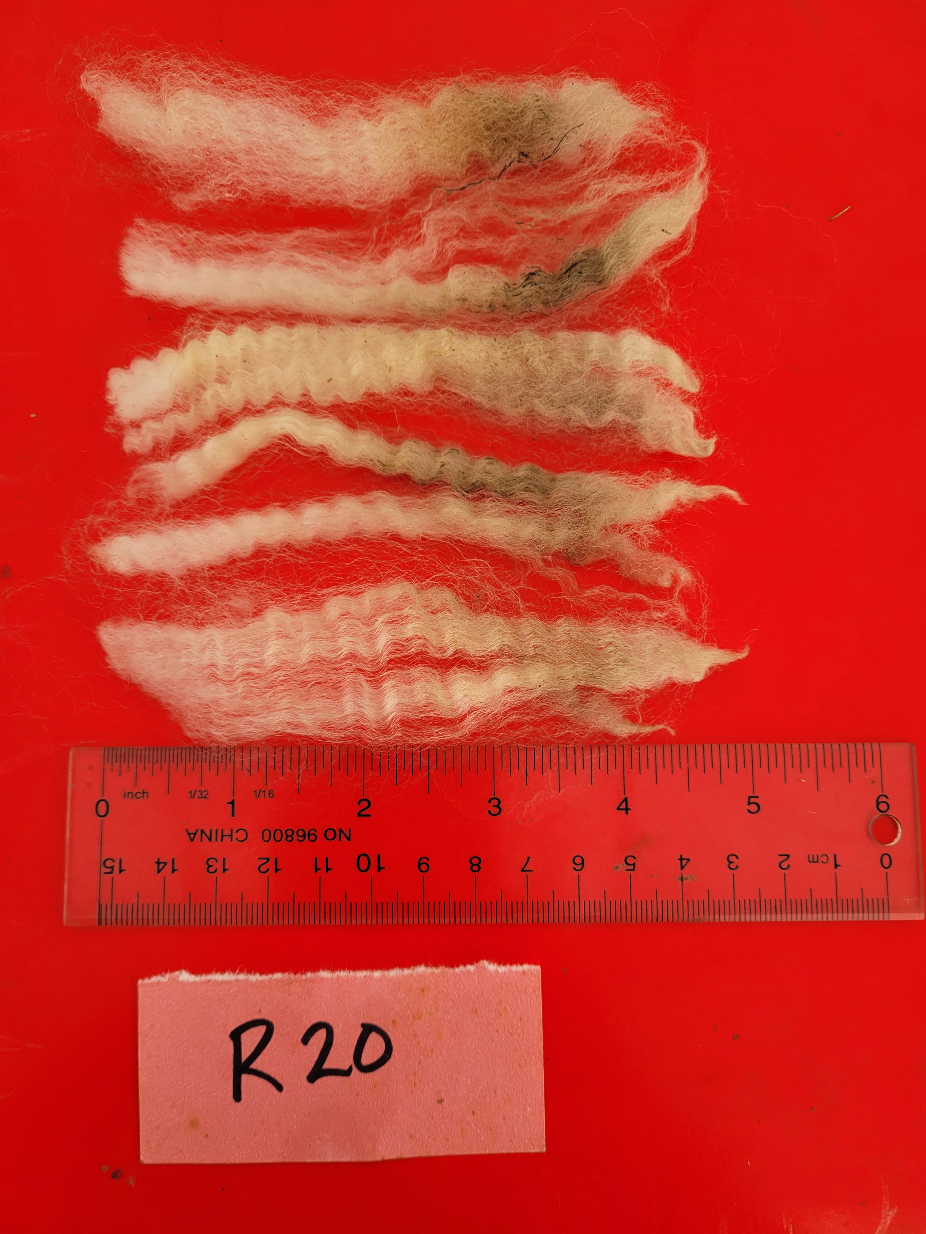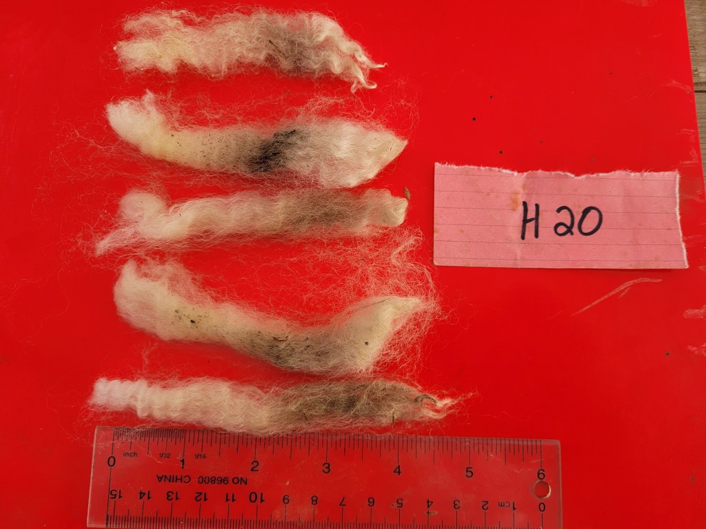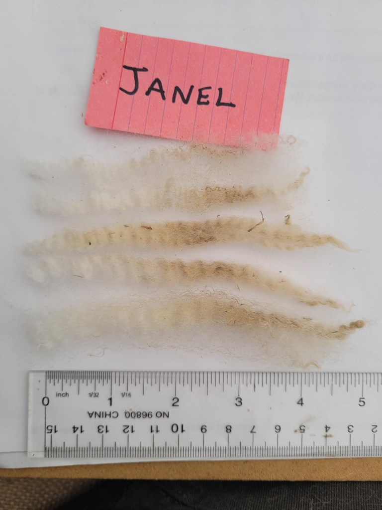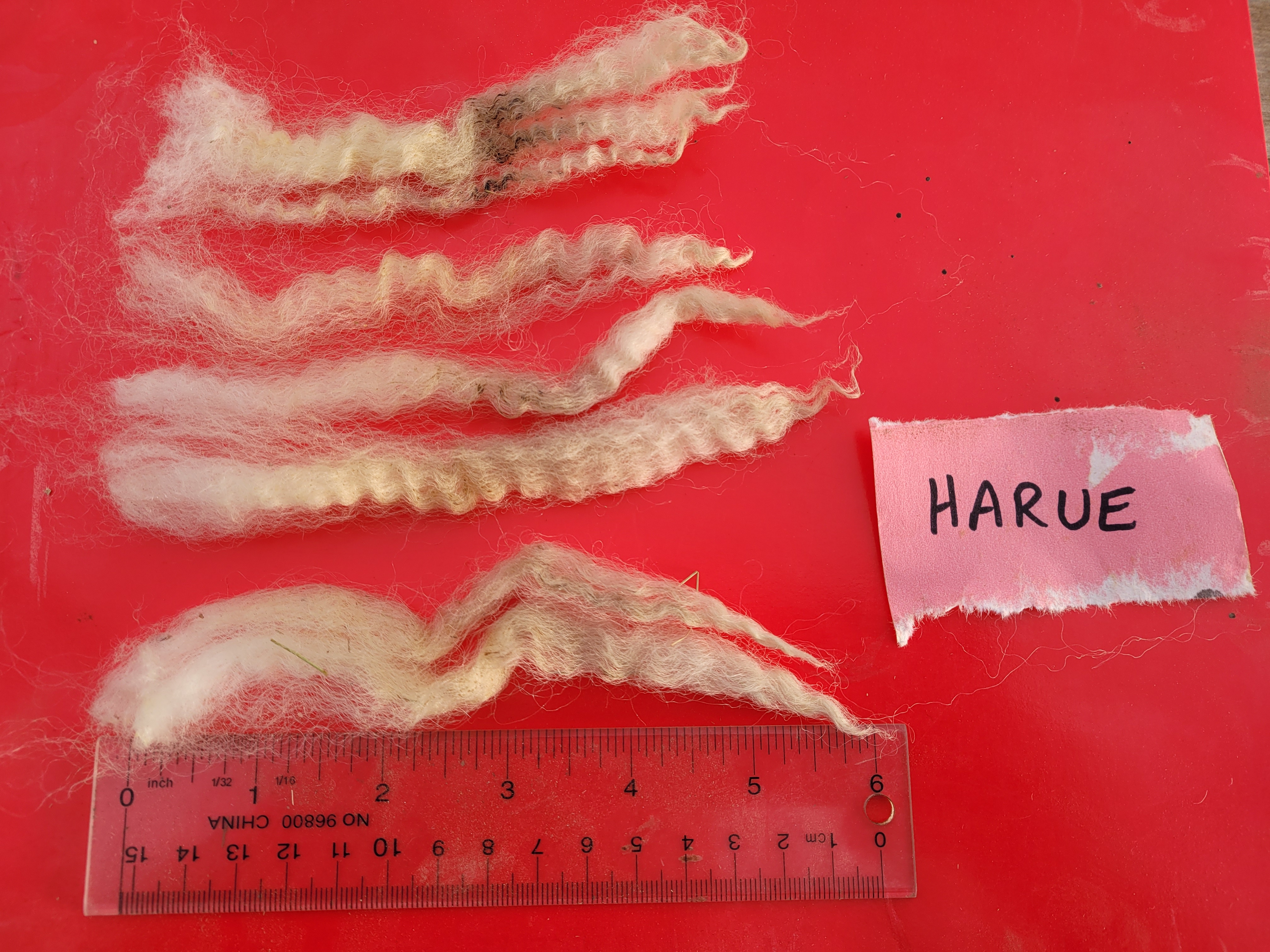 5 – 6 1/4″ staple. Wide, very well defined crimp. Bright, some luster. Some loftiness. A few 2nd cuts, but fairly free of VM 5lb 15oz $52