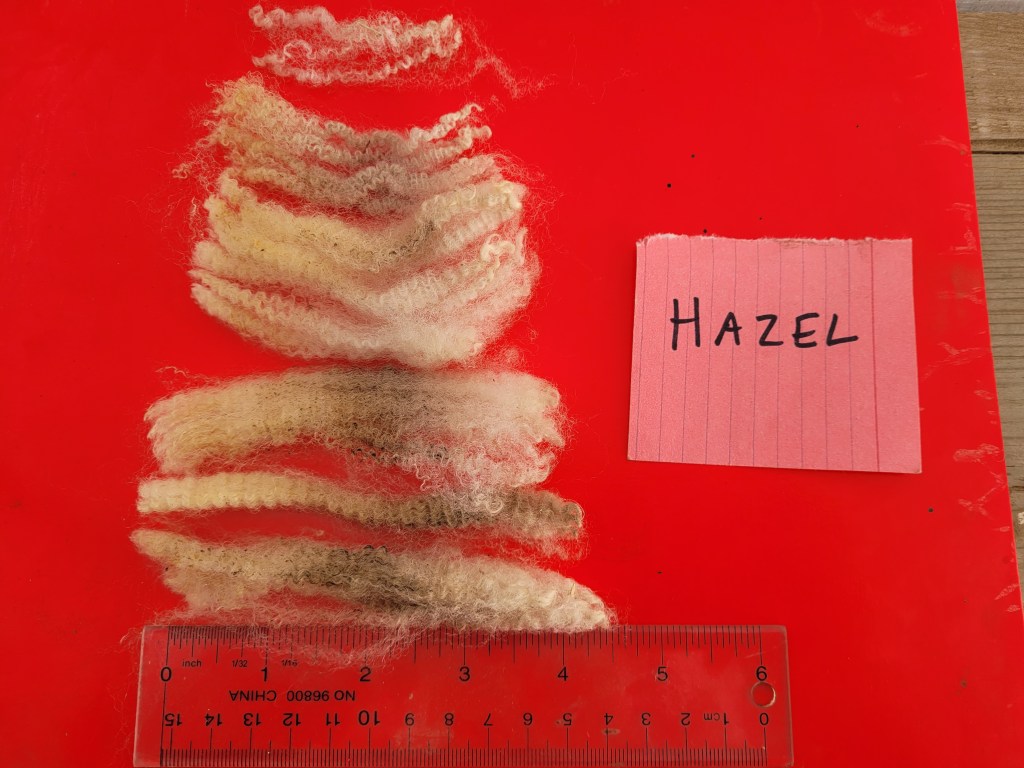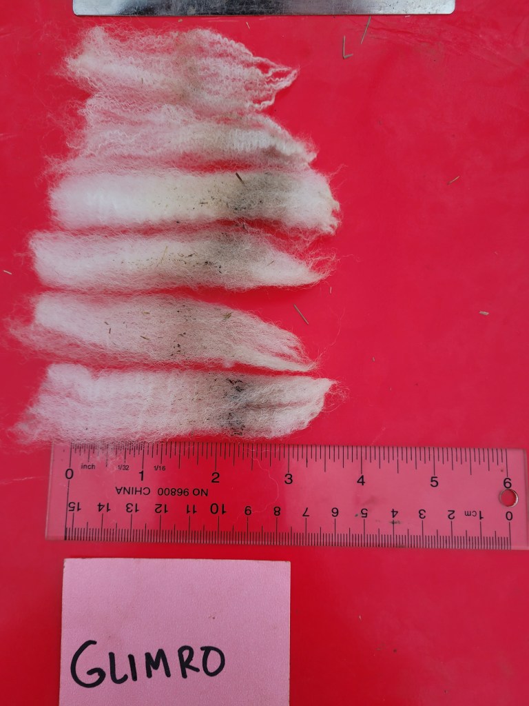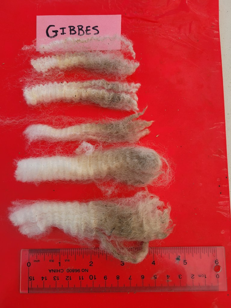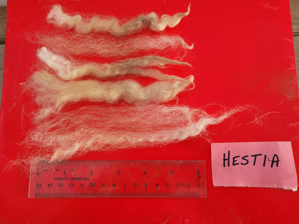 5 – 6 1/4″ staple. Wide, very well defined crimp. Bright, some luster. Some loftiness. A few 2nd cuts, but fairly free of VM 5lb 15oz $52