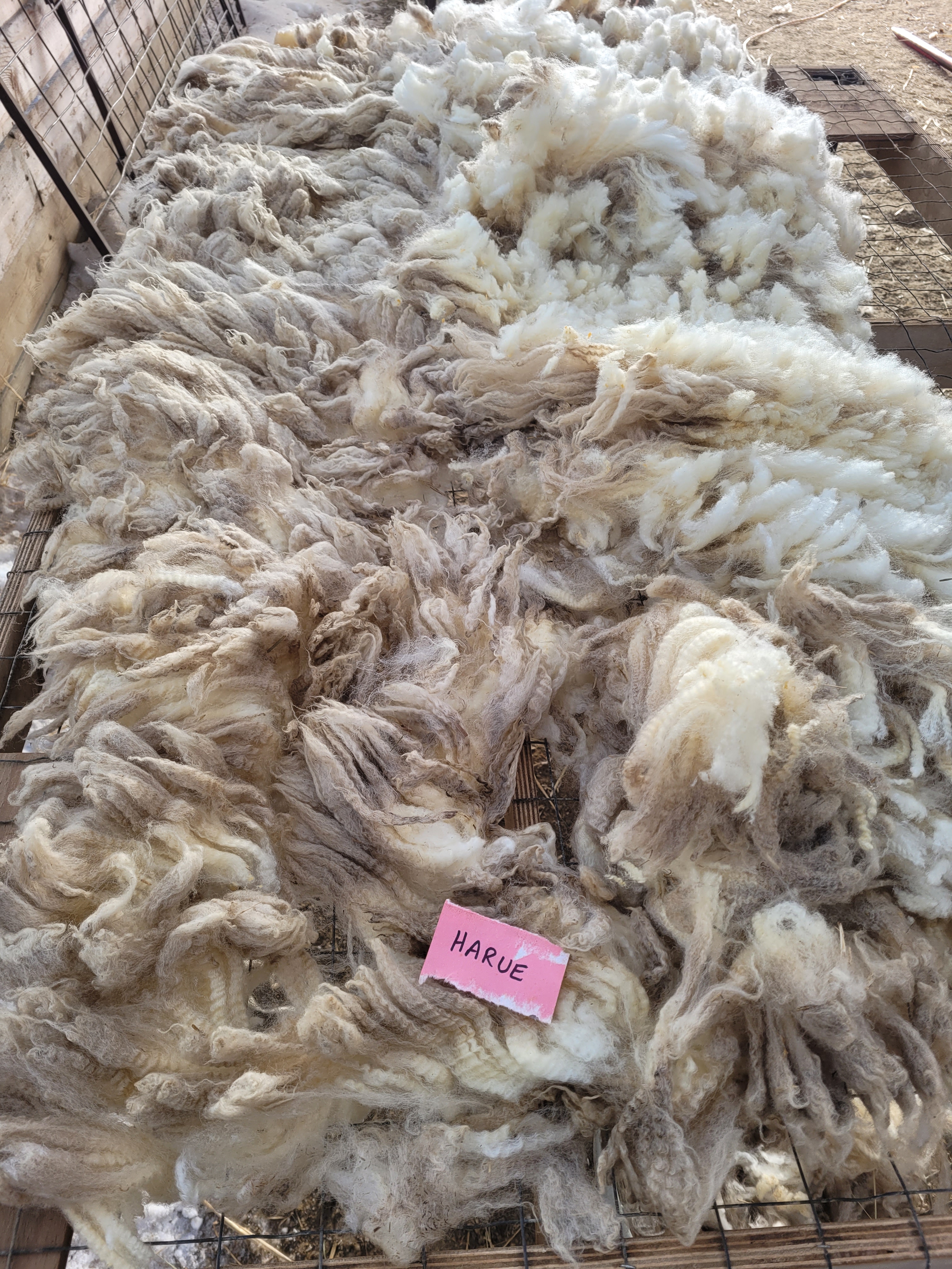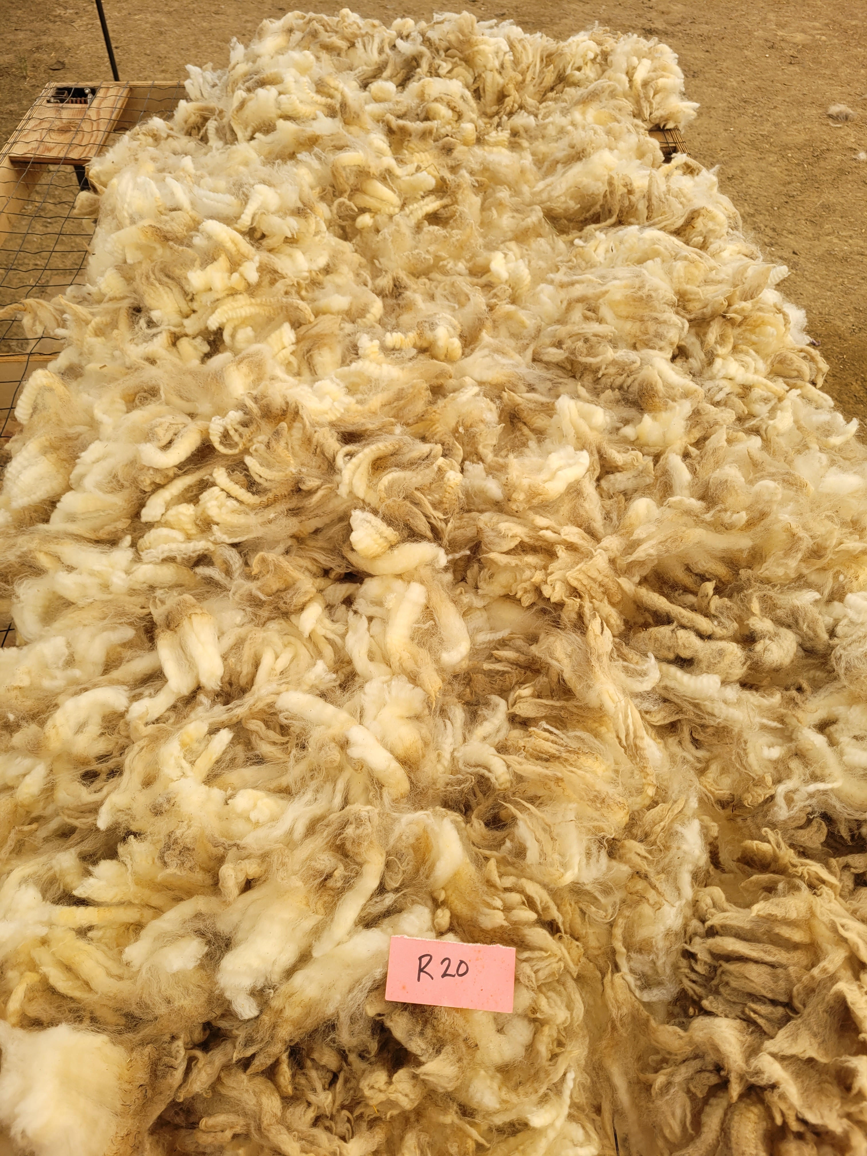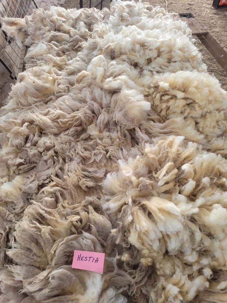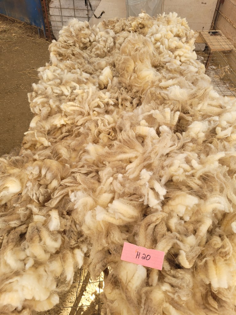 4-5″ staple (bit 3 1/2″). Wide crimp, mostly well defined. Very bright and somewhat lofty. Some 2nd cuts and a bit of VM. Somewhat jumbled, possibly missed some skirtings. 6lb 13oz $60