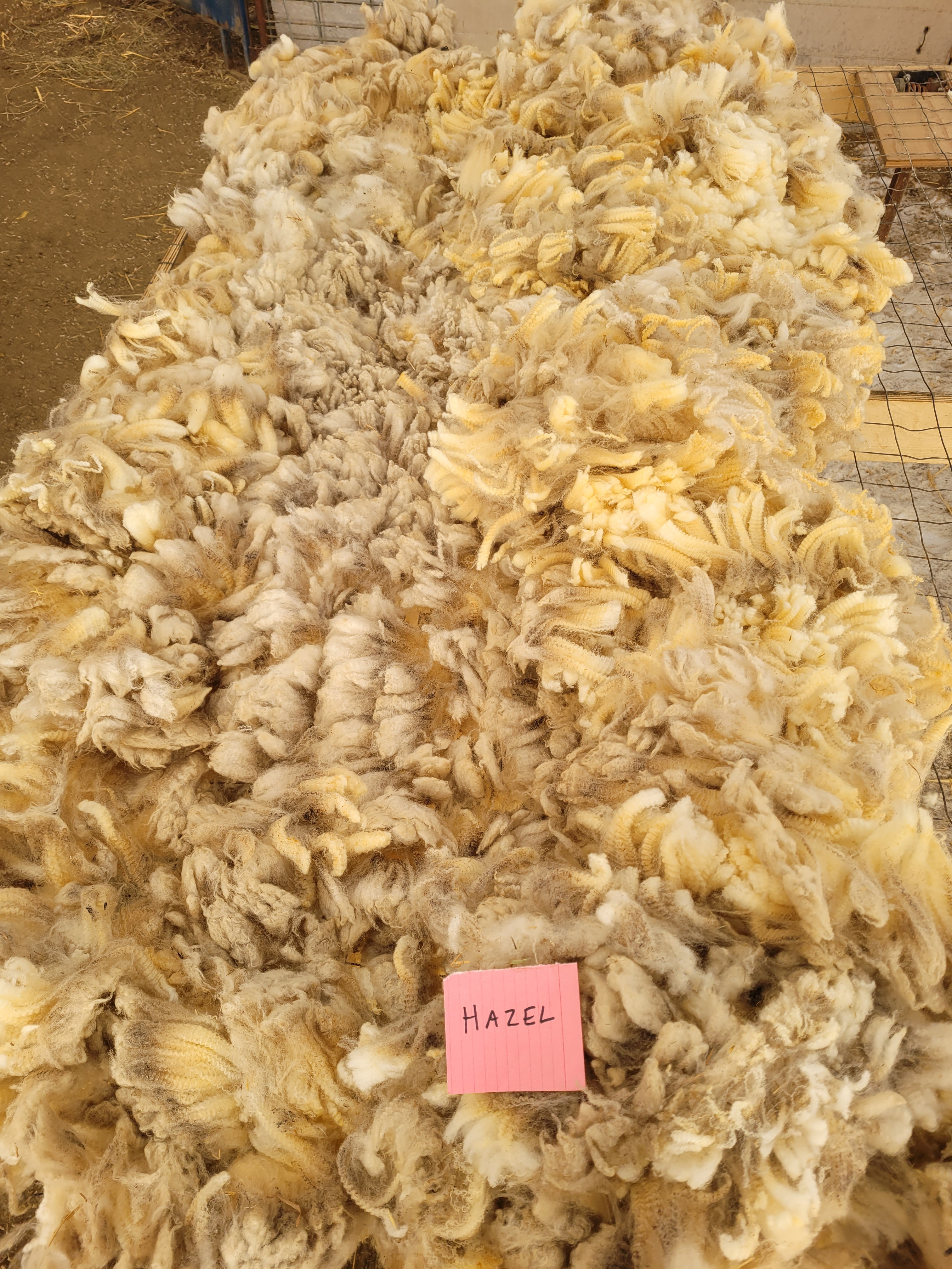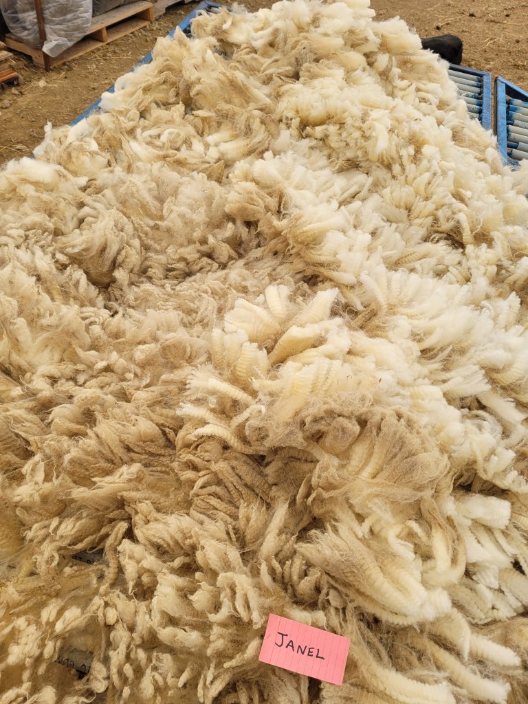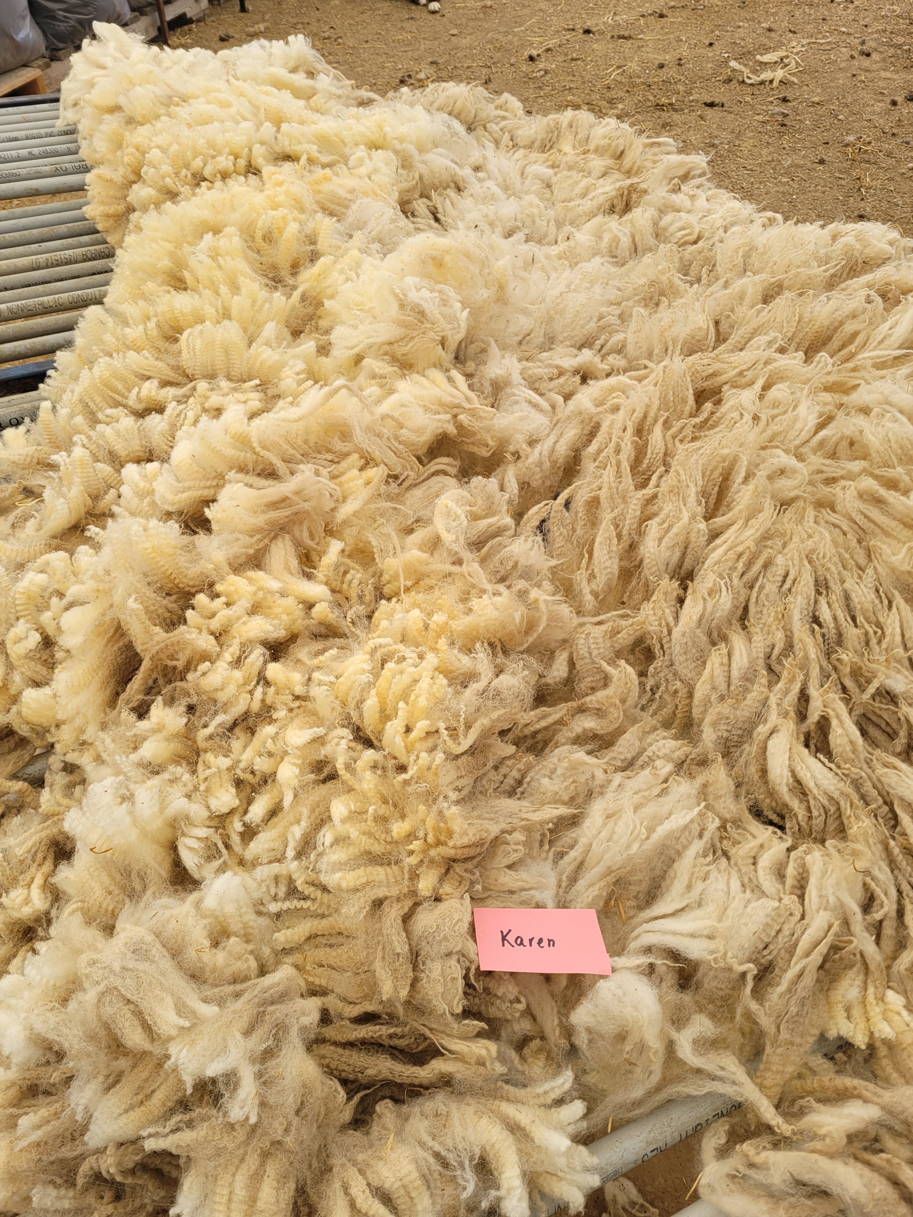 4-5″ staple (bit 3 1/2″). Wide crimp, mostly well defined. Very bright and somewhat lofty. Some 2nd cuts and a bit of VM. Somewhat jumbled, possibly missed some skirtings. 6lb 13oz $60